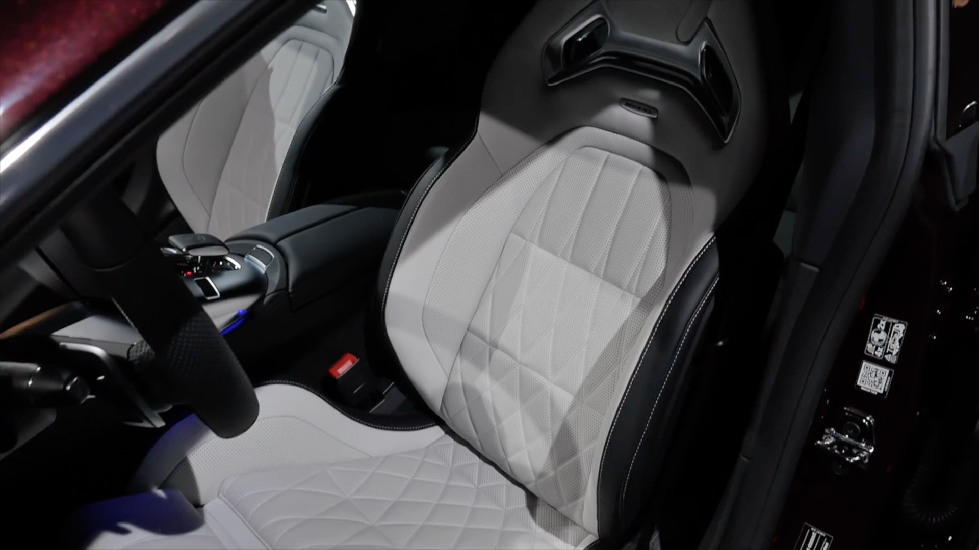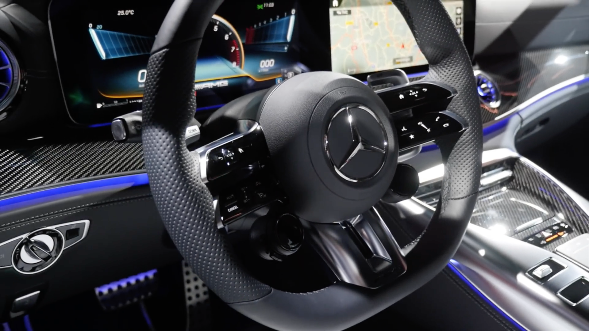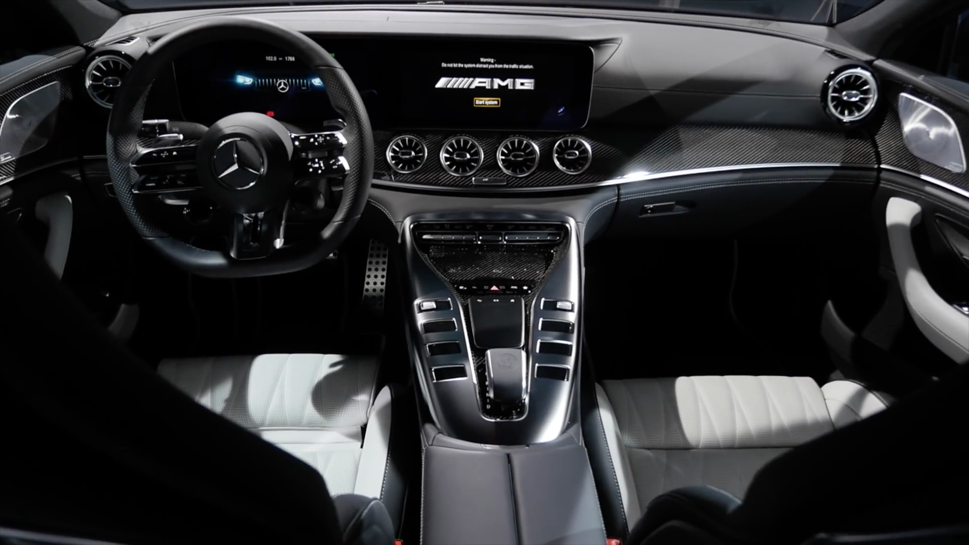 内饰采用最新家族设计豪华运动风格,环抱式中控台配备双12.3英寸液晶显示屏,功能丰富的MBUX多媒体系统,涵盖全部车辆功能信息,中控采用天然纹理灰色白蜡木饰板点缀,配备全新双辐式AMG平底方向盘,采用纳帕真皮包覆,嵌有亮面触控式操控按键,并有震动反馈,方向盘还集成了传感器,可感知驾驶者是否双手在握,提升安全性,圆形的AMG Drive Unit旋钮更加精致漂亮,方向盘后方的换挡拨片能提供更多驾驶乐趣。