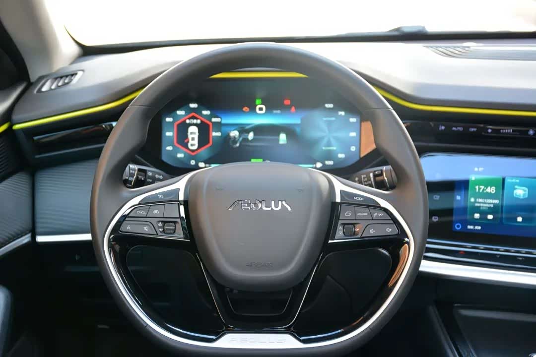 接着就是这款三幅式多功能方向盘,采用人体工程学设计,握感出色,并且平底的设计也极富运动感。方向盘的设计非常精细,采用真皮、钢琴烤漆、镀铬装饰条等多种材质,营造出十足的高端感。方向盘后面那条淡绿色的装饰条是混动车型专属,从中控延伸至左右两侧车门,非常醒目。