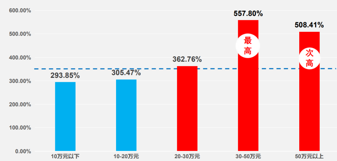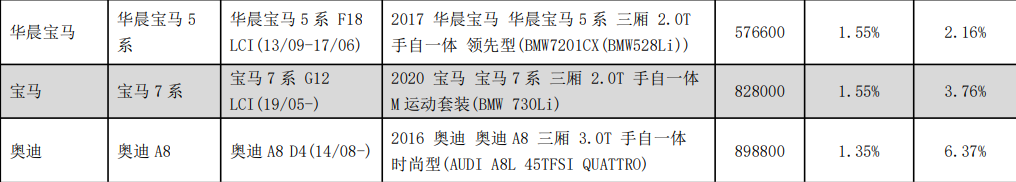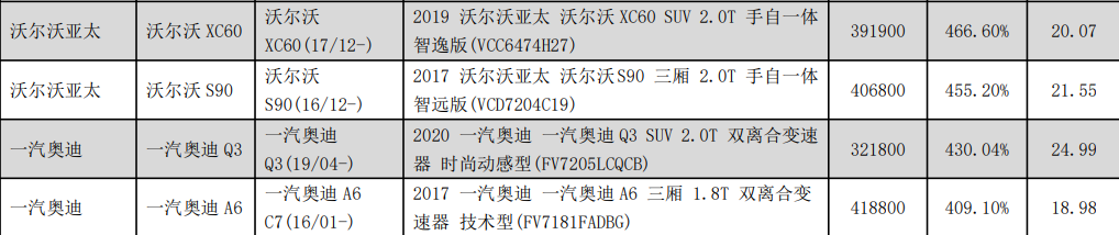50万以上车型都是奔驰宝马奥迪,其中奥迪A8的零整比最高,达到了559.62%。但50万以上车型的零整比差距不大,数值都很接近,并不像50万以下车型的零整比,一个天一个地。