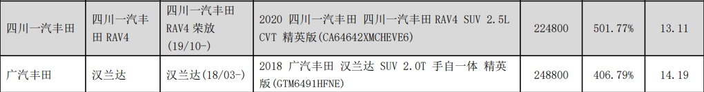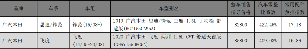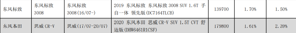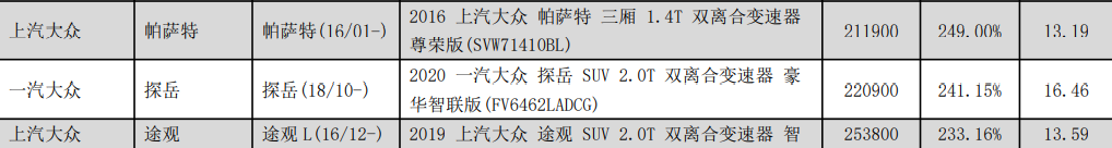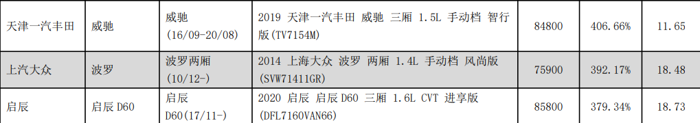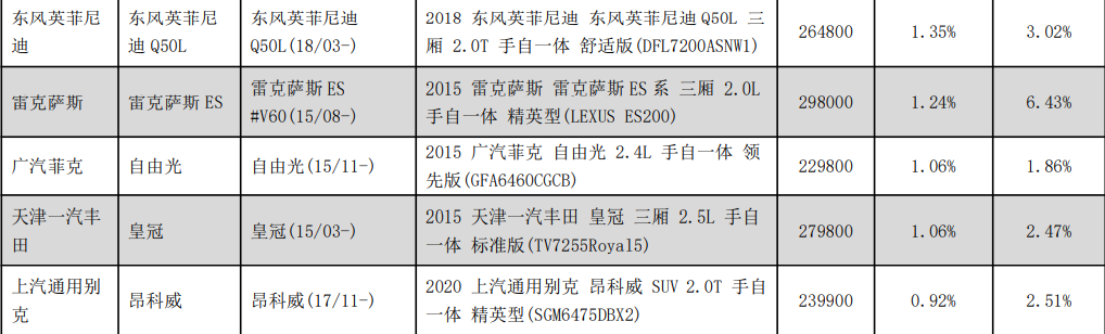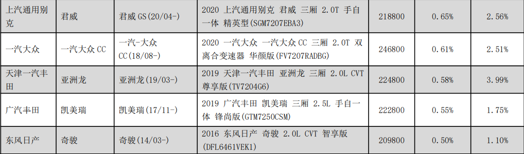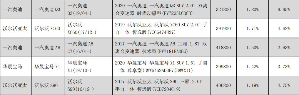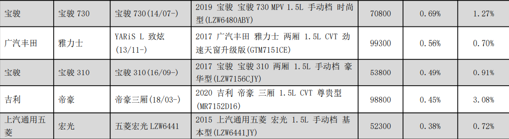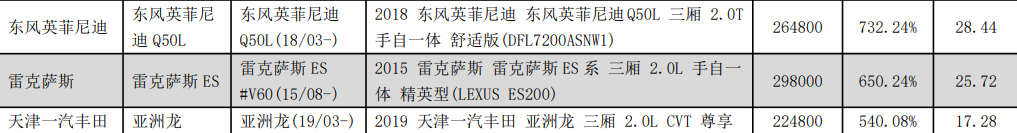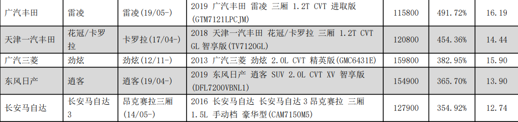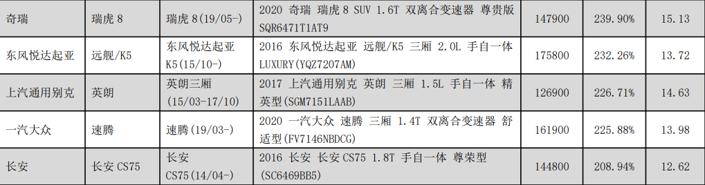 汽车零整比系数(每个价格区间只列举最高和最低的五个车型)