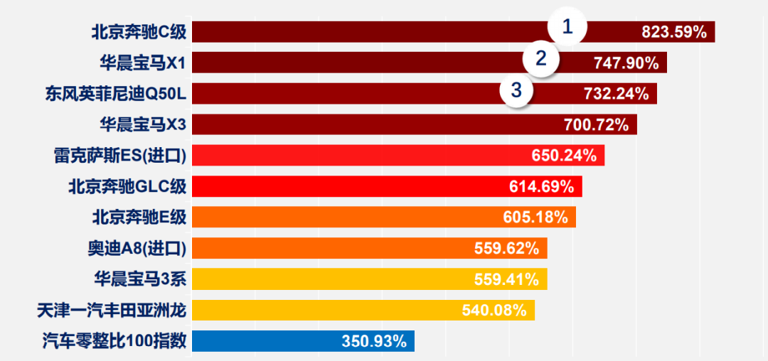 零整比最高的就是北京奔驰C级,最高零整比排行榜前十几乎都被豪华品牌占领,而最后一名的丰田亚洲龙也以540.08%的零整比上了前十排行榜。