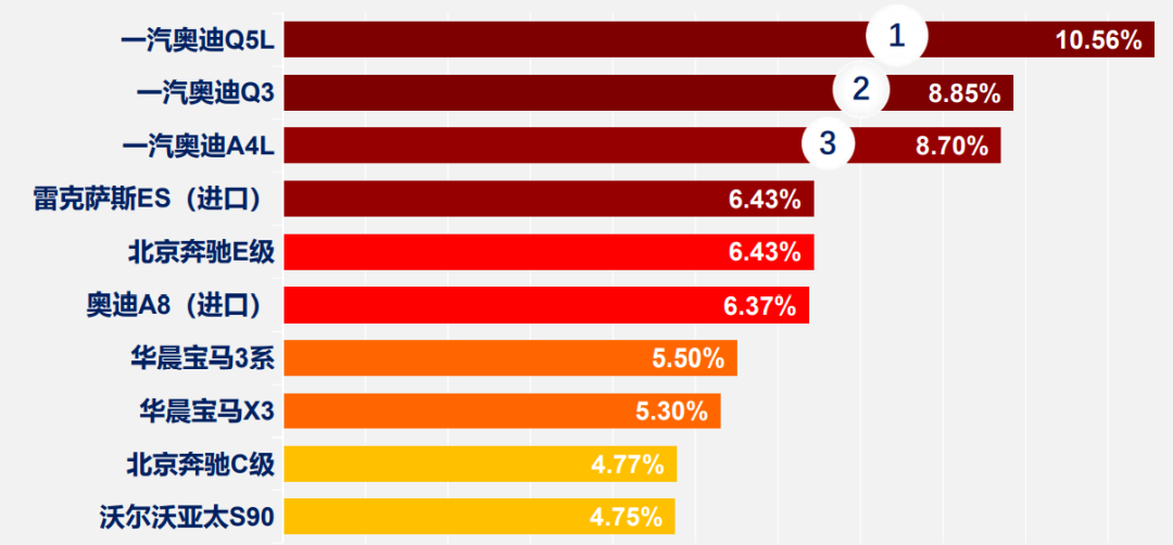 图中能够明显的看出奥迪一骑绝尘,前十名有四辆都是奥迪,而奥迪Q5L,奥迪Q3,奥迪A4L直接霸占了前三名。所以说奥迪不愧是灯厂,灯做的非常漂亮,维修起来的价格也是非常的美丽。奥迪Q5L的大灯零售价竟然能够占到整车价格的1/10,所以说奥迪车平时剐蹭蹭哪儿都可以,就是别蹭车灯。