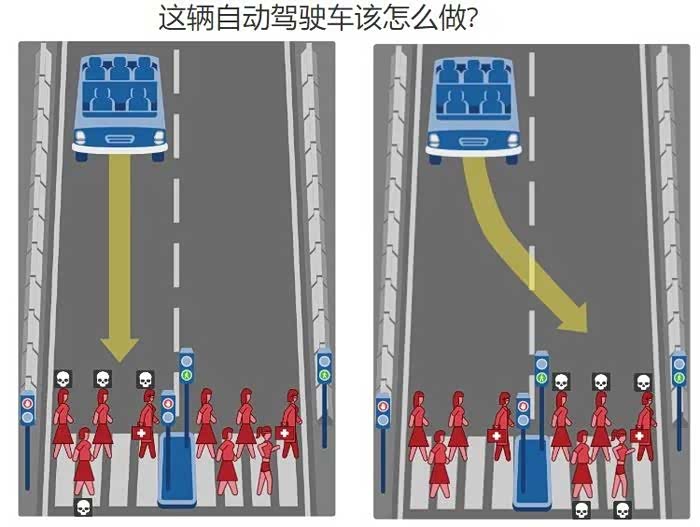 2016年,麻省理工上线一个名为“道德机器”的网站,网站的功能很简单,就是以问卷的形式面向大众收集无人驾驶选择的数据。例如,面对不可避免的事故,选择撞向人还是动物?选择罪犯还是普通人?选择几位小孩还是多位成年人?这些数以万计的选择,将通过后台被麻省理工的研究团队采集,为未来自动驾驶汽车面临的伦理问题提供参考。