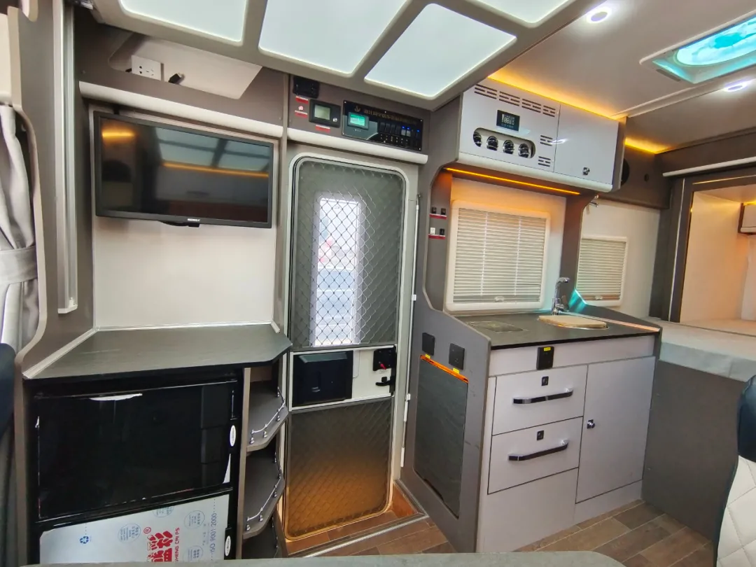 夏季来临,考虑到即使在房车内也能吃到新鲜美味的食物,在会客区对面配有一台48V85L的房车专用双开门冰箱,可供冷冻冷藏食物。冰箱上方安置了一台24寸的电视,可供旅途娱乐。