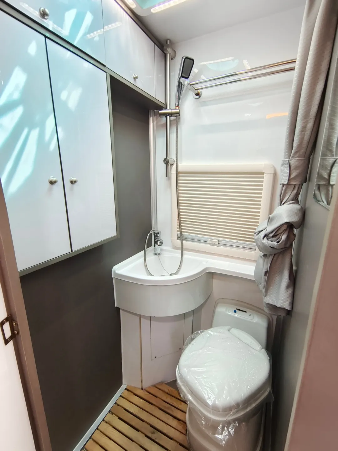 卫生间采用一体式设计,配有盒式抽拉马桶,抽拉式花洒、毛巾架、储物柜等,满足日常的洗漱需求。水路方面,配有净水箱220L,灰水箱80L。电路方面,采用3000W智能充电逆变一体机、48伏供电系统 、220V电源插座等。