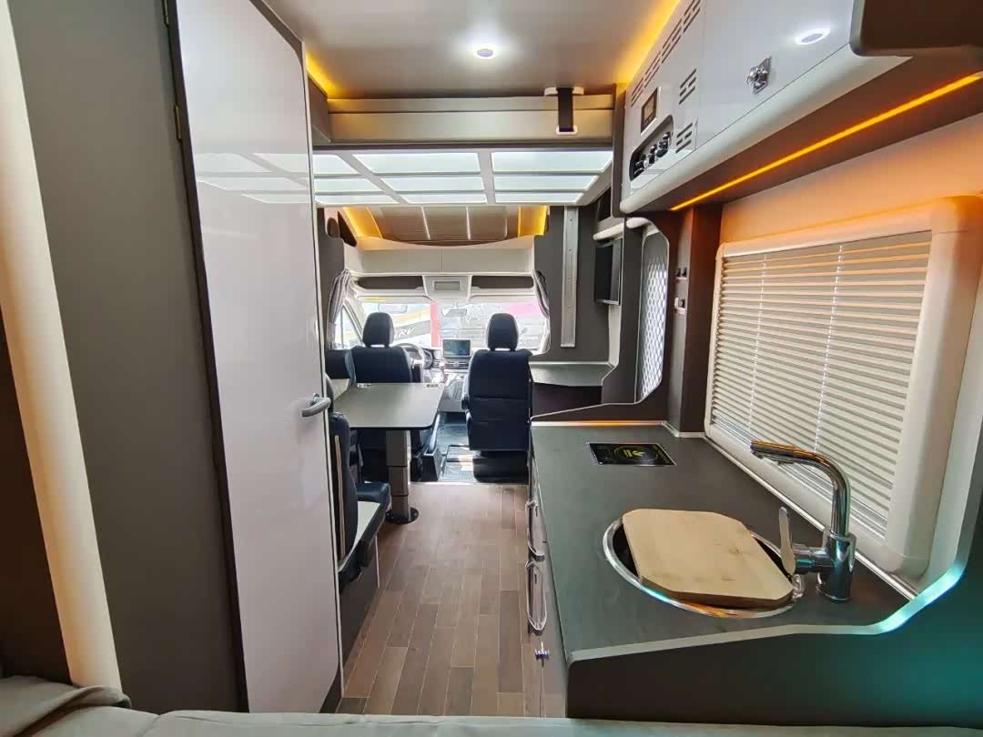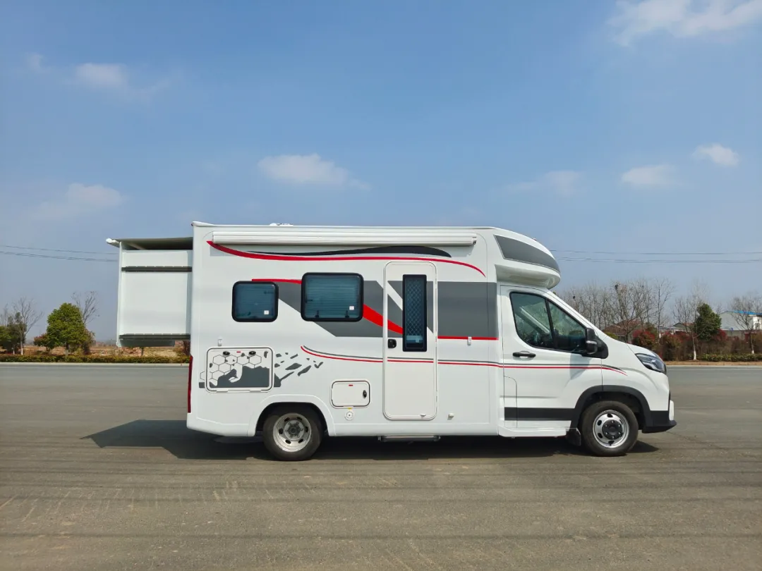车侧的配置齐全,配有遮阳棚、电动踏步、注水接口、市电接口、散热口、贯通式储物仓、外置液化气抽拉灶等。车身尾部可后拓展,为休息区带来更为宽阔的空间。