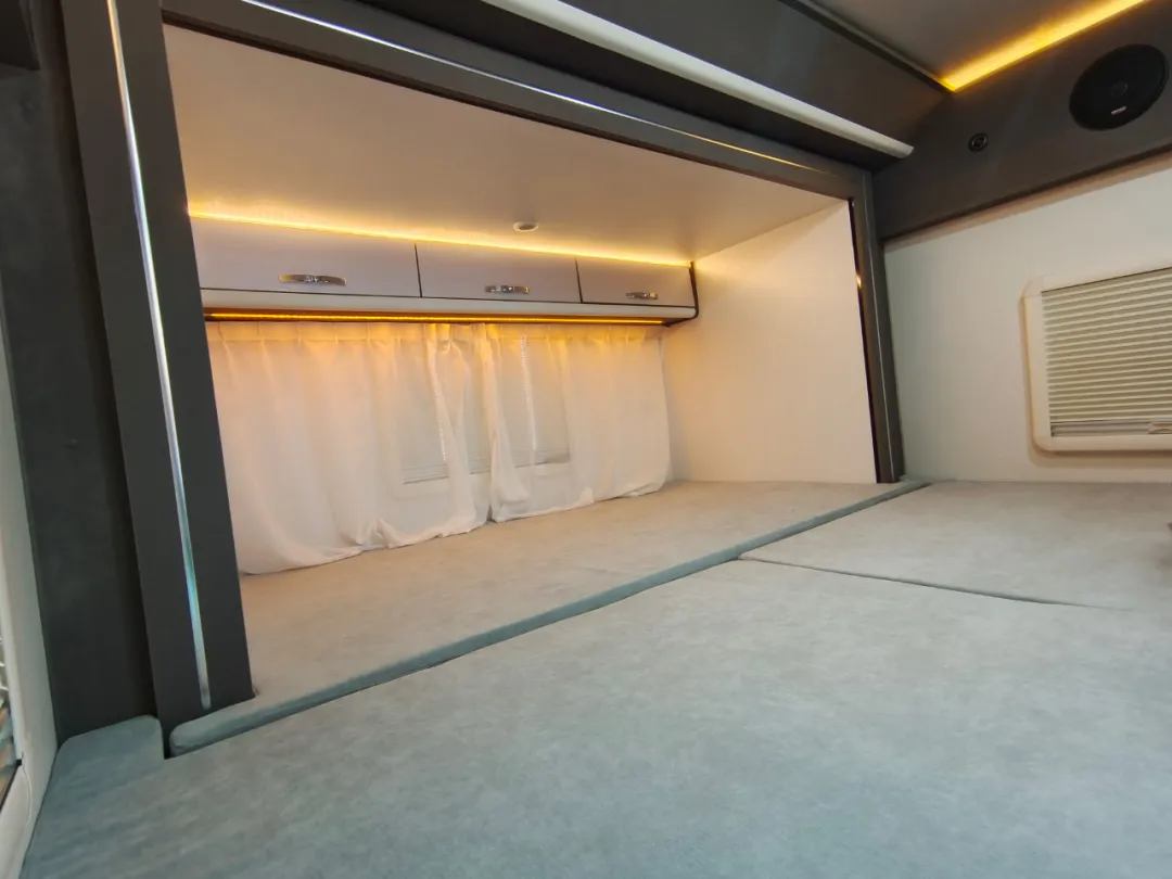 外推窗配备防蚊纱窗和隐私帘保障您的睡眠隐私。床头配有吊柜,方便存储日常杂物。尾部的休息区,加上前方的卡座沙发床、电动吊床,加起来车内总共有3张床位,可谓将车内的空间利用拉满!