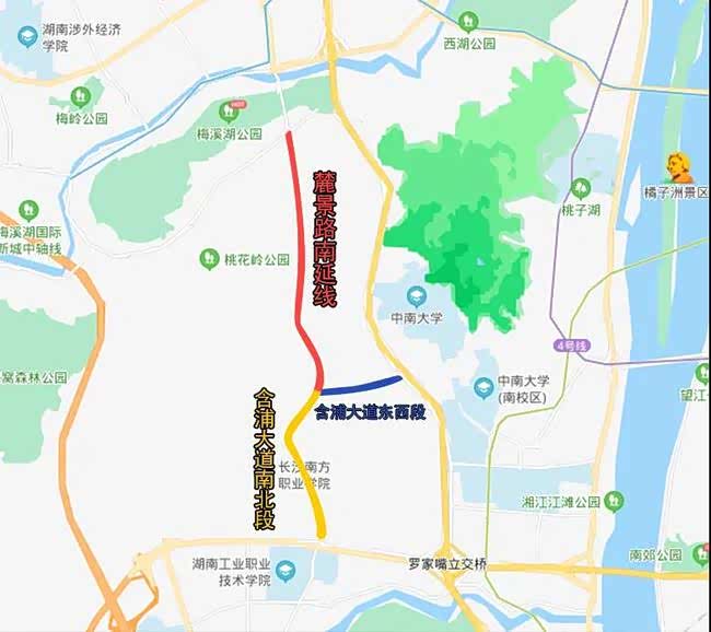 麓景路南延线全长3.9公里,分为隧道和路面两种设计方案,其中隧道全长2.3公里。主线隧道采用双向6车道建设标准,设计时速为60公里/小时。该路段北侧连接梅溪湖大桥,南侧连接含浦大道。含浦大道(西二环-学士联络线)全长2.9公里,南临含浦科教园,北靠桃花岭,项目分为南北段、东西段两期建设,东西段道路后期可以向东延伸至西二环。