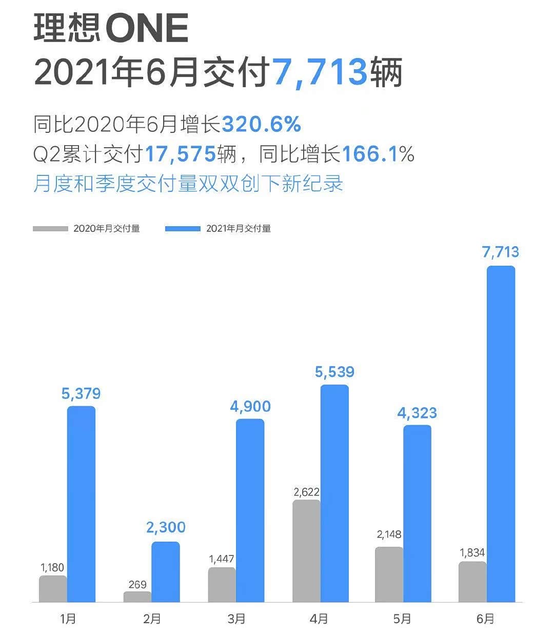 根据理想汽车最新发布的6月份销量数据显示,理想汽车单月交付7713辆,同比增长320.6%;第二季度交付17575辆,同比增长166.1%;今年1-6月份,理想汽车累计交付30154辆,接近去年全年的总交付量。