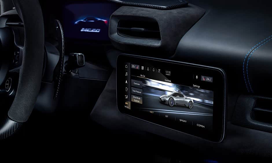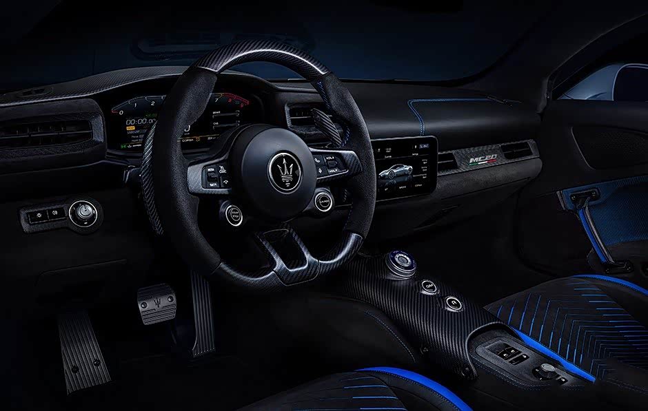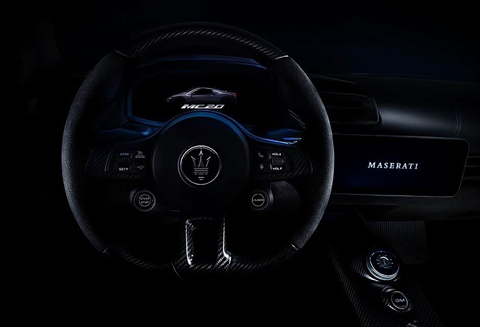 方向盘是在玛莎拉蒂赛车试车手 Andrea Bertolini(前 MC12 世界冠军)的帮助下开发和设计的。MC20是第一款在方向盘上设置启动按钮的玛莎拉蒂汽车。采用碳纤维材质,包裹黑色皮革,但如果想要更蕾丝的感觉,可以选择 Alcantara 材质。