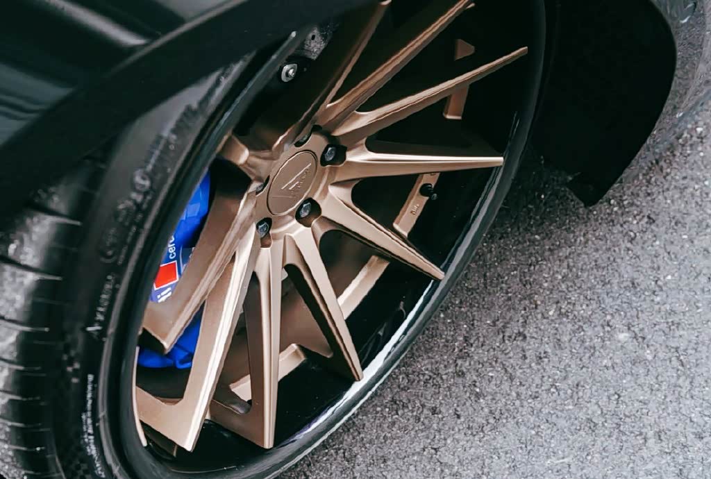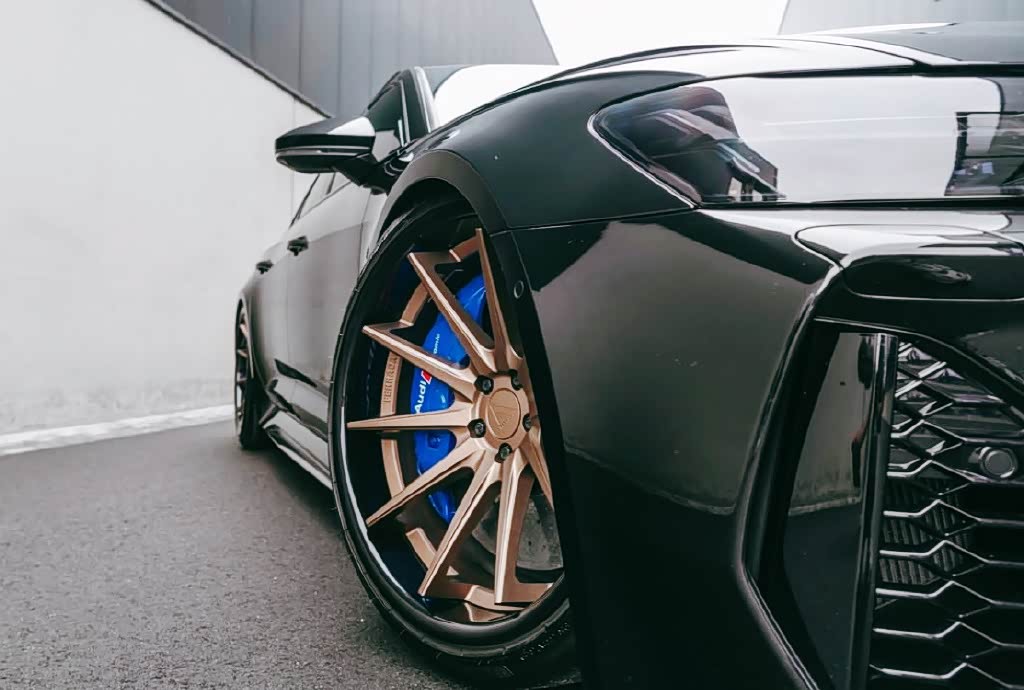 侧面车身比例设计协调,简洁平直的腰线干练、凌厉,车门凹面处理锋利,后视镜设计精致,车顶向下倾斜的窗线流畅又很自然。金色的轮毂造型非常吸睛,动力表现也是非常出色。蓝色卡钳增添了一丝时尚运动气息,车尾平直的线条略显层次感,尾灯与头灯相呼应辨识度很高,双边共四出的排气管很有运动性能范。