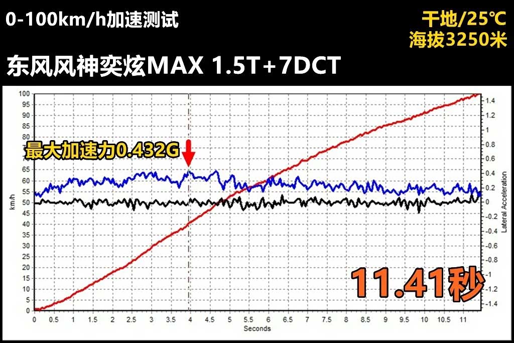 这款奕炫MAX配备号称自主最强的1.5T缸内直喷引擎,匹配7速双离合变速箱,输出达到150kW/320Nm。测试当天气温是25℃,海拔3250米。