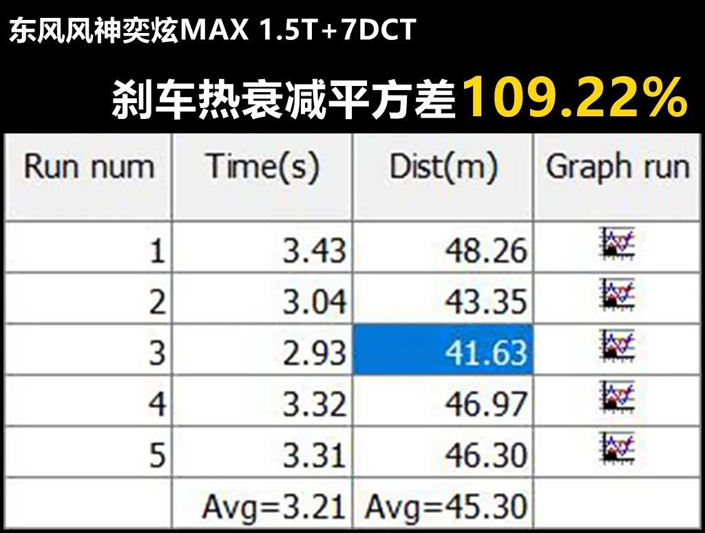 至于刹车,奕炫MAX表现得并不好——5次100-0km/h刹车平均成绩为45.30米,最好成绩41.63米,刹车热衰减平方差低至109.22%——按照我们的分级,刹车热衰减平方差≤25%算完美,≤50%算优秀,≤75%为合格。我们针对2020年测试过的所有车型,统计了各个细分市场的刹车表现平均数据,奕炫MAX的刹车表现大大低于去年各细分市场的平均值。