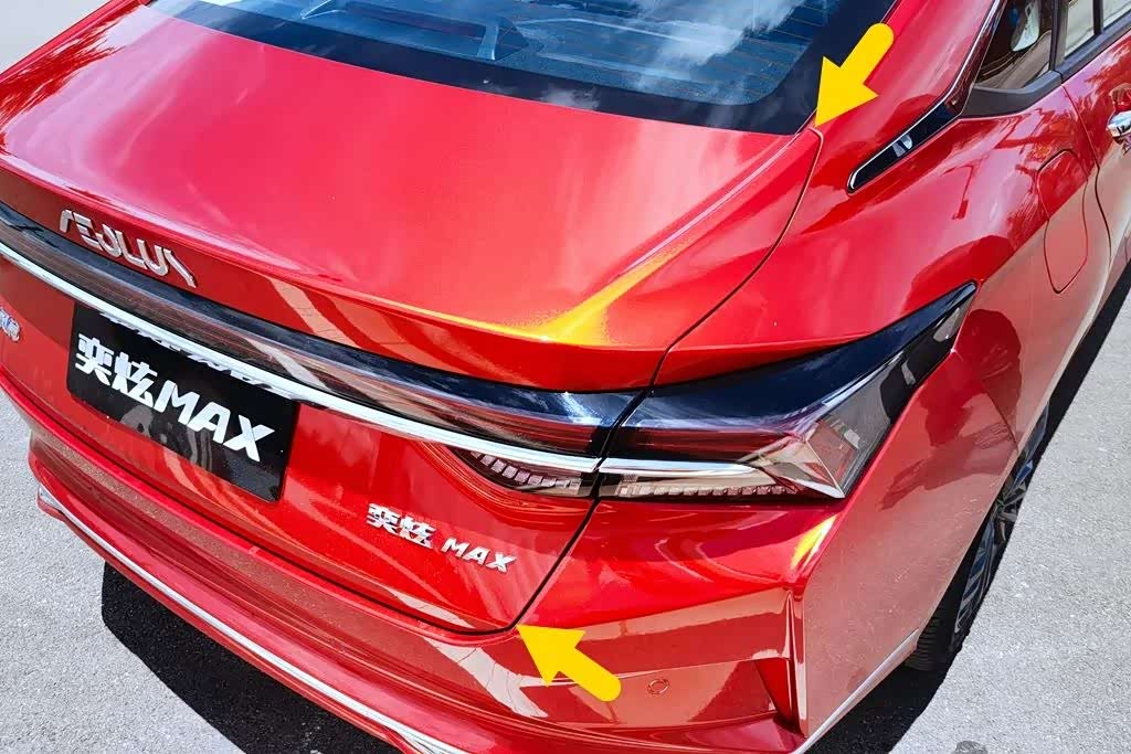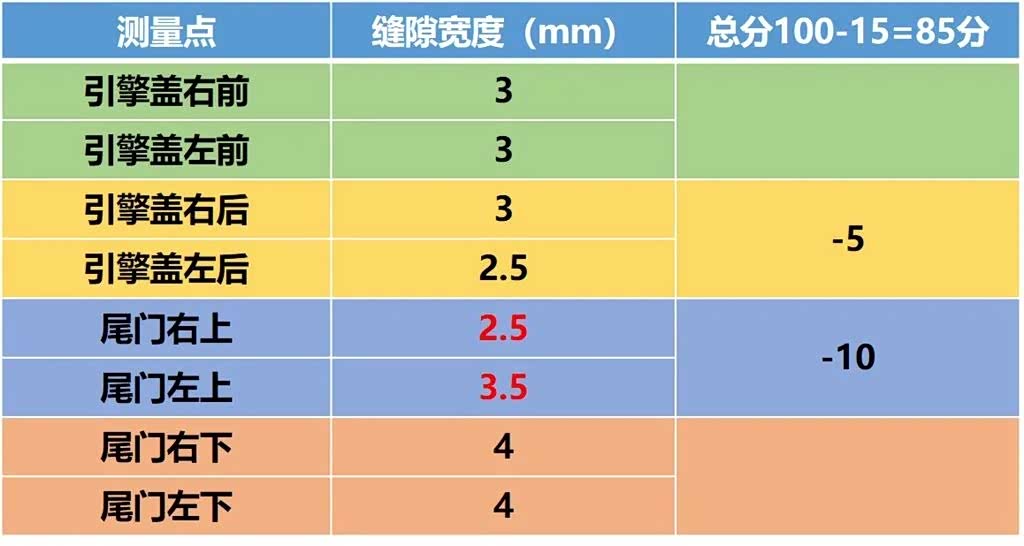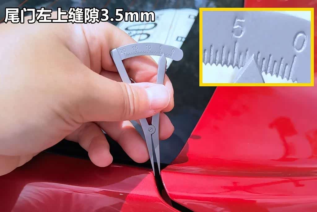 我们在奕炫MAX上选取的钣金缝隙测量点共有4对8组,分别是引擎盖靠近A柱下端左右缝隙、引擎盖前端靠近大灯的左右缝隙、尾门上端靠近尾灯的左右缝隙,以及尾门下端的左右缝隙。基本上这一组数据就能反映出这款车的整体钣金工艺。