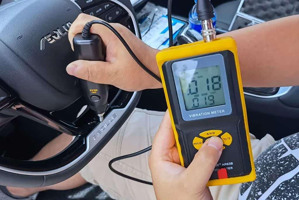 而方向盘在热车怠速状态下的最大振幅,则是达到了0.019mm。按照我们的标准,这个数据≤0.005mm属于完美,≤0.010mm则是优秀,而0.019mm,是迄今为止我们测到的排名倒数第三的数据。