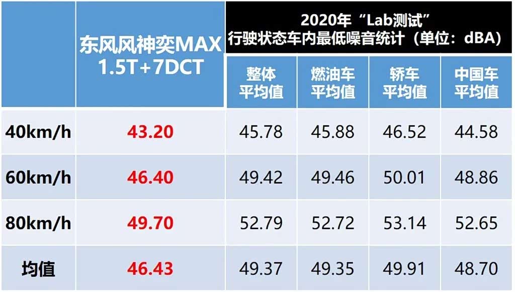 在40km/h、60km/h和80km/h匀速状态下,奕炫MAX车内最低噪音分别为43.2dBA、46.4dBA以及49.7dBA,三个速段的最低行驶噪音均值达到了46.43dBA——毫无疑问,奕炫MAX是我们迄今为止测试过的最安静的中国品牌轿车!