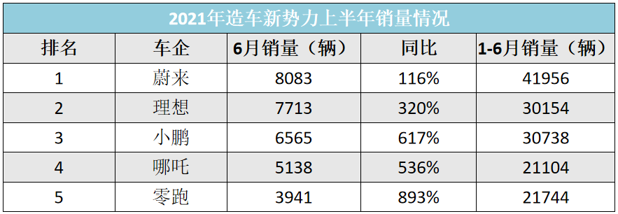 其中,蔚来汽车6月份交付量达8083辆,同比增长116%,创历史新高;小鹏汽车交付6565辆,同比增长617%;理想汽车交付7713辆,同比增长320%;哪吒汽车交付5138辆,同比增长536%;零跑汽车交付3941辆,同比增长893%。