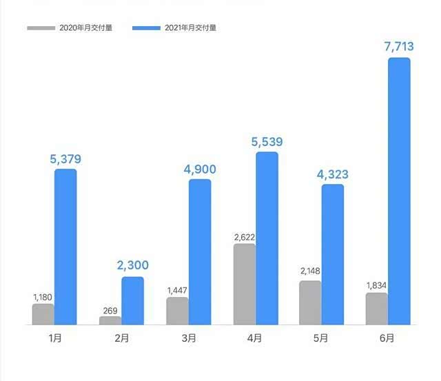 数据显示,理想汽车6月交付7713辆理想ONE,同比2020年6月增长320.6%,环比2021年5月增长78.4%,创单月交付量新纪录。
