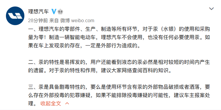 晚间,理想汽车官方再发微博称:“制造一辆智能电动车,理想汽车不会使用,也没有任何必要使用汞。如果在车上发现汞的存在,一定是外部行为造成的。”文章最后,理想官方微博还建议车主报案处理。