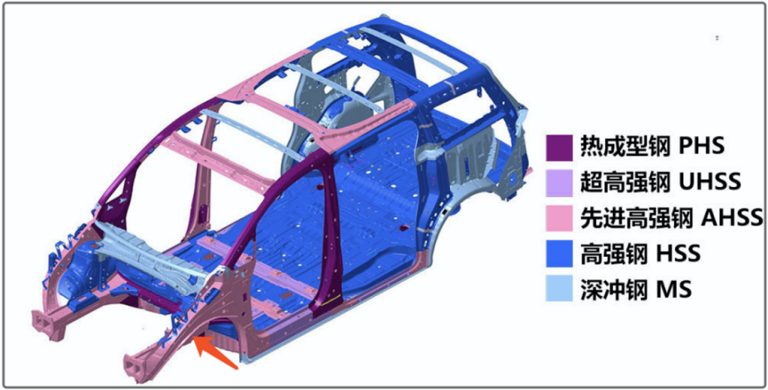 红色箭头为荣威iMAX8在前纵梁上采用的延伸至A柱的上边梁设计