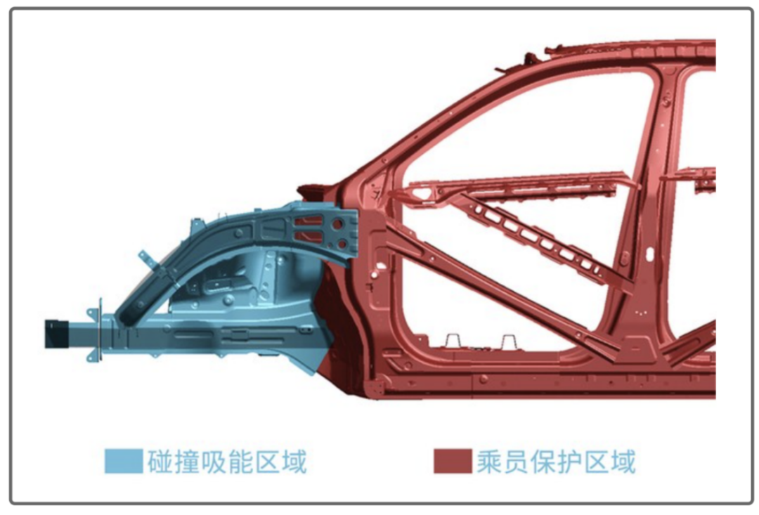 比如正面碰撞中,如果溃缩区足够的话,那碰撞能量就会在传递至乘员舱时大大减小,乘员舱只需承接更小的冲击力,可以大大降低使身处其中的乘员受伤害的概率。