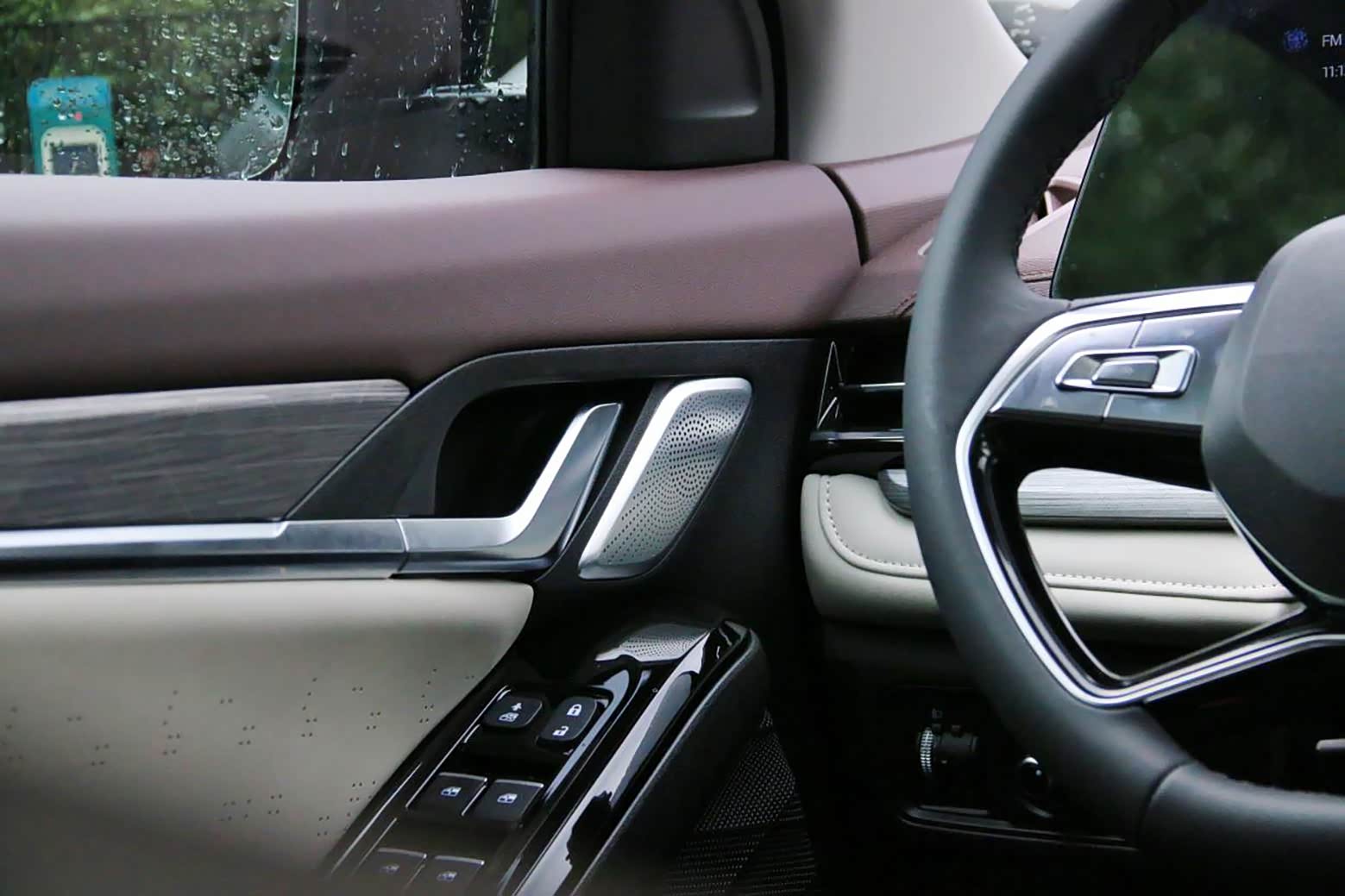 用料方面,中控台和门板上沿均覆盖了软性搪塑材质,贯穿式空调出风口下方有一块表面带有纹理的装饰板,内部蕴含着64色灯带,夜晚点亮后颇有一种夜店风属性,并且可以根据自己喜好调整颜色动态。
