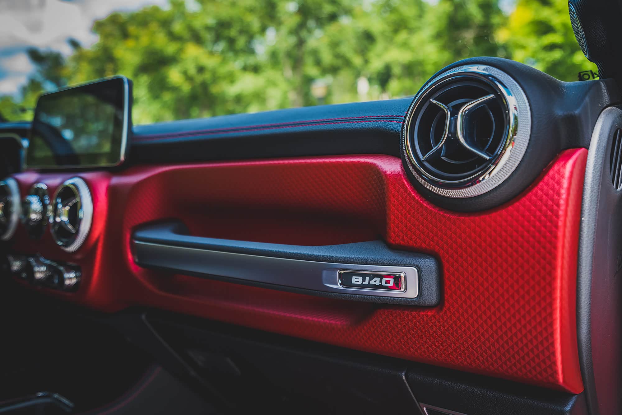 BJ40外露的车门铰链很容易让人联想到包括BJ212在内的一系列北汽越野经典车型,垂直的风挡和外挂式备胎也是硬派越野车的标准造型。拉开车门,手拉着A柱上把手的同时脚踩着镀铬装饰的车门踏板,每一次的城市间代步都让驾驶者仿佛在山野间要开启新的征程一般富有仪式感,这样的仪式感就是硬派越野车典型的上车方式。