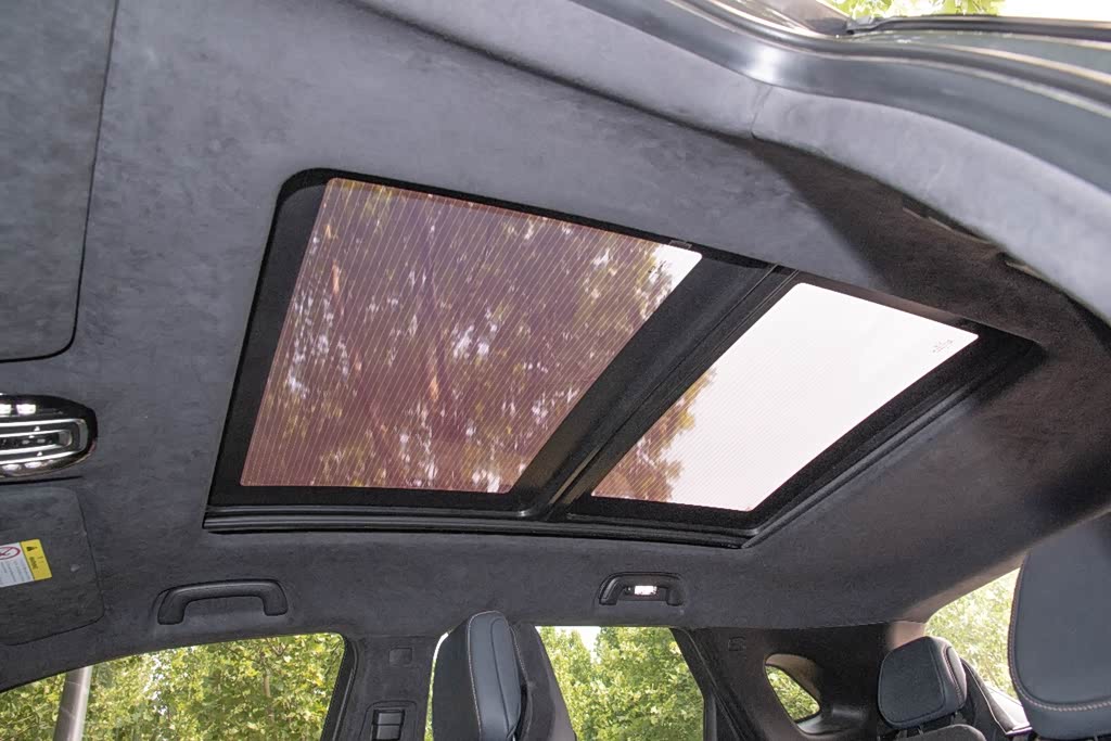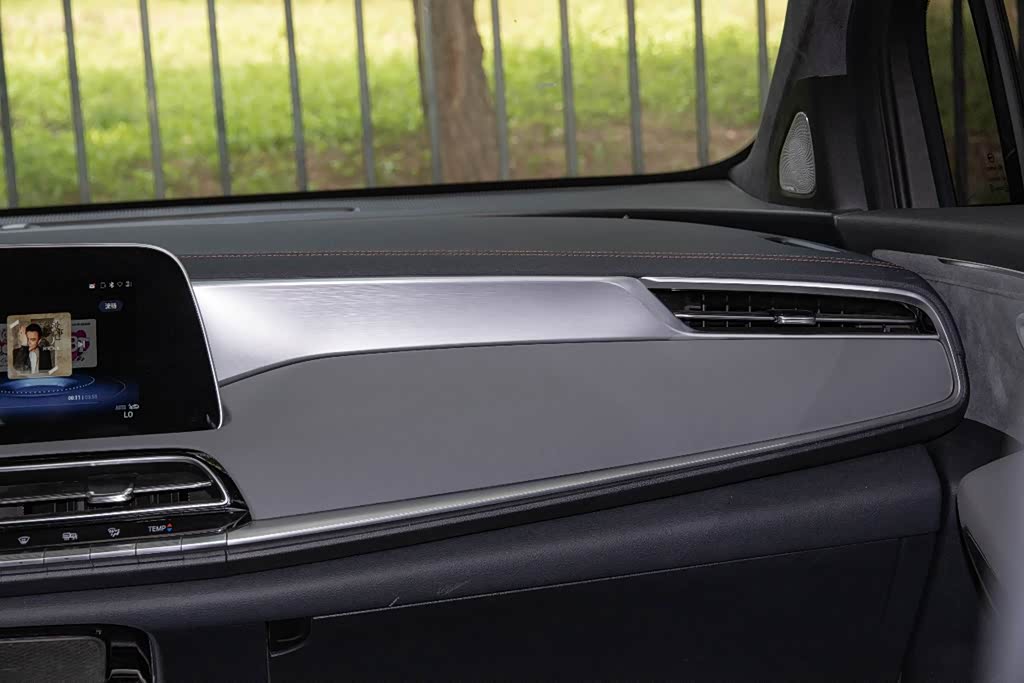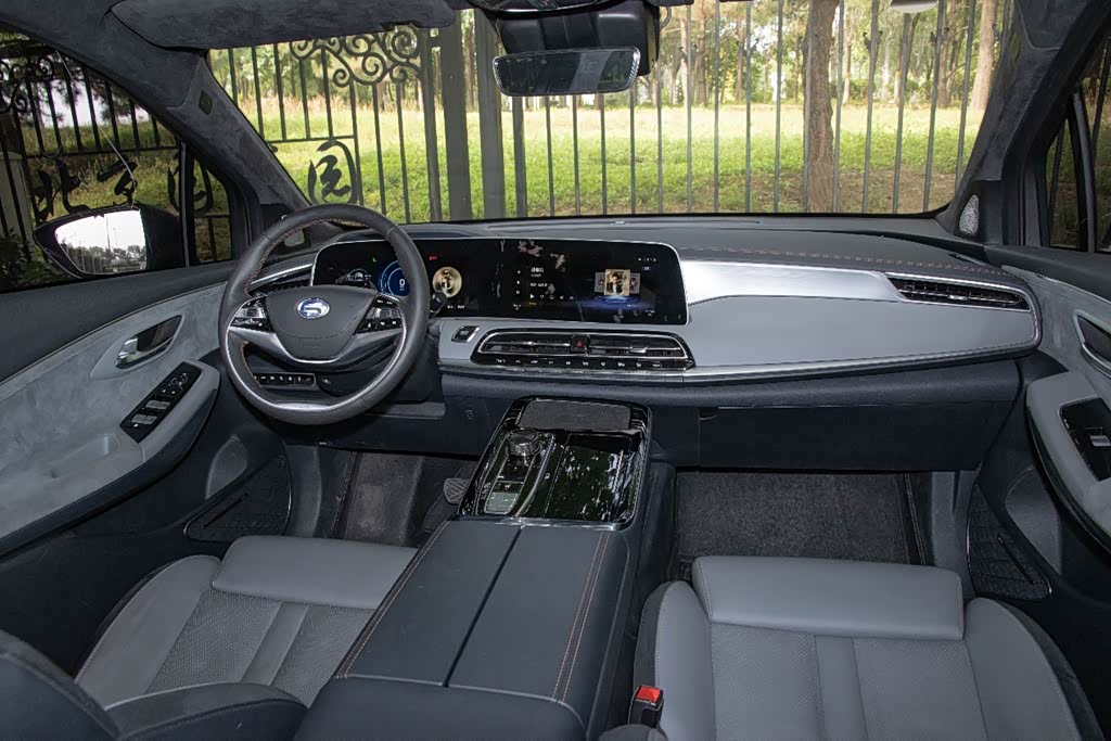 另外我们拿到的这款Aion LX在顶棚和门板等部分还装配了麂皮绒材质,虽然摸上去挺柔顺的,但这样的却让车内显得更暗了,尤其是阴天下雨或晚上的时候,倒不如普通皮质敞亮。