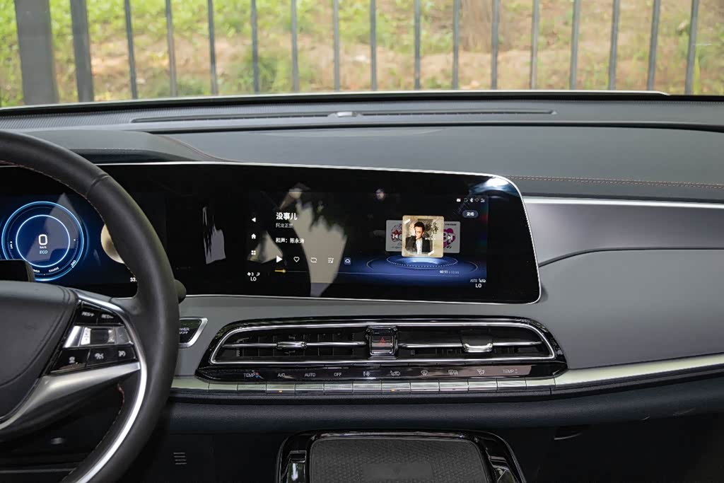 在内饰设计上,Aion LX采用了比较简约的风格,前排中控台也是大板块的布局,比如副驾面前的两块中控饰板、中间梯形的空调控制区域、甚至仪表盘和中控显示屏也连在了一起。这样的处理和Aion V是一样的,只不过相同位置部件相比,Aion LX的要更小巧一些,就比如相同的连屏,Aion LX上的更像是一个正梯形,看起来并没有Aion V的连屏更大更有气势,这或许是因为Aion LX前排中央的空调区域更大,而Aion V则是将连屏和空调控制区做成了一体式设计。