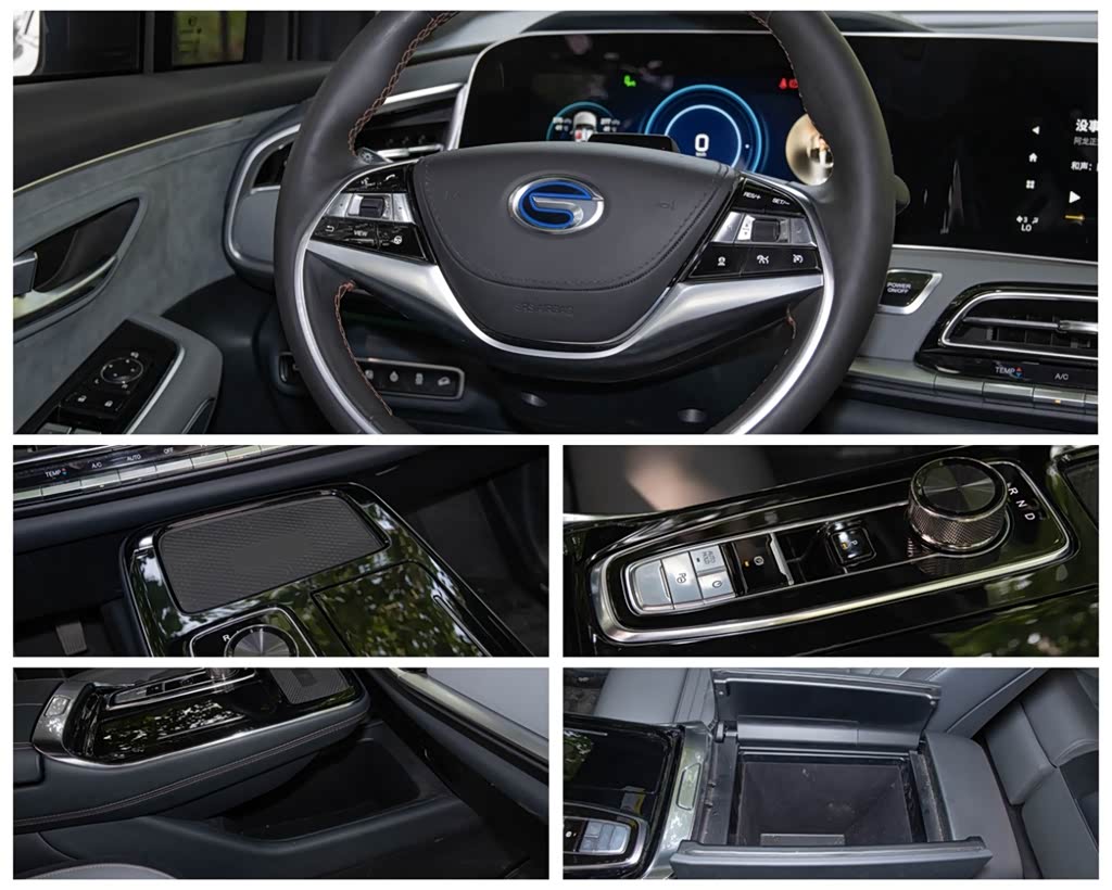 Aion LX的前排设计还有两处和Aion V不同,一个是副驾饰板,Aion LX采用了斜面板搭配镀铬饰板的设计,而Aion V则是立面板加上烤漆饰板和镀铬饰条的组合;另一个就是主副驾的车门扶手了,Aion LX像很多高端车型一样,将这部分“支棱”了起来,上面有车门车窗以及外后视镜控制按键,车门把手附近也没有特别的装饰了,而Aion V的车门扶手虽然是“平躺”的,但门把手周围有镀铬饰条装饰。对于这两处的不同,我认为并没有好坏之分,不过我倒是比较喜欢Aion V的前排设计,看上去更有质感一些。