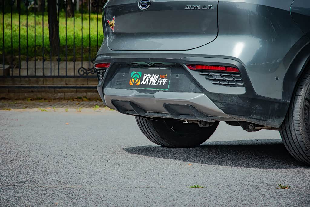 作为一款定位于“智能轿跑SUV”的车型,Aion LX的车尾设计得倒是有点“萌”。首先从整体造型来看,Aion LX的尾部很圆润,没有过多的棱角。其次如果仔细观察,可以看到车尾顶部竟然有一对“猫耳”,这其实是一个镂空的扰流板,起到降低风阻,提升NVH和续航的作用。此外Aion LX的贯穿式尾灯也采用了比较柔和的设计,和扰流板组合起来看,让Aion LX的车尾看起来非常像一只慵懒肥猫的大胖脸。而车尾底部两侧的金属点阵饰板和底部护板,恐怕是运动基因的最后一点倔强了。