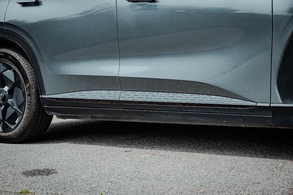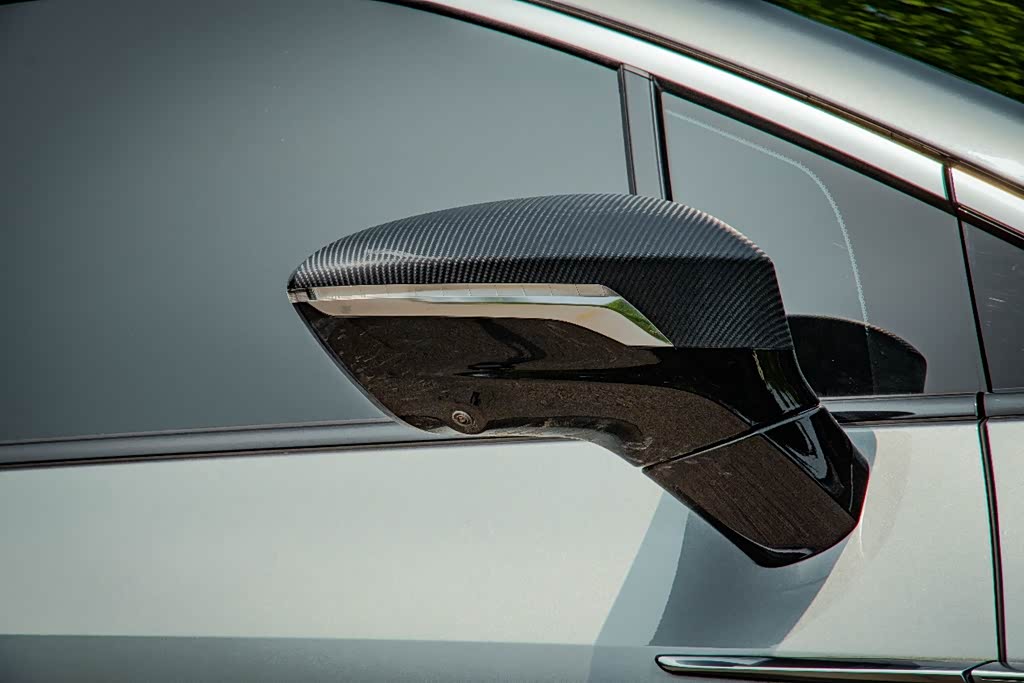 当然如果仅是这两个细节,肯定算不上“潮”。我们拿到的这辆Aion LX试驾车虽然是80智尊版,但却装上了只有顶配才有的“碳纤纹D柱饰板”和“碳纤纹外后视镜壳体”,再加上20英寸星钻轮辋,一下就有性能车那个味儿了。此外在车门下方,Aion LX还装配了一个有着点阵突起的金属饰板,看起来还挺精致的,也是和前脸下方的通风口造型相呼应了。