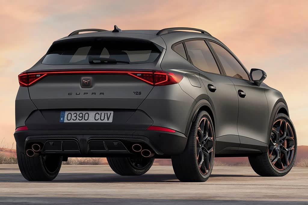 来到车尾,贯穿式尾灯的设计非常时尚,后车窗上方也增加了尾翼的配置,LOGO同样更换为青铜色,下方还有Cupra的标识。值得注意的是,Cupra Formentor VZ5的排气管布局非常不同,采用双边竖置四出排气,并在排气管口也增加了青铜色点缀,非常具有设计感。