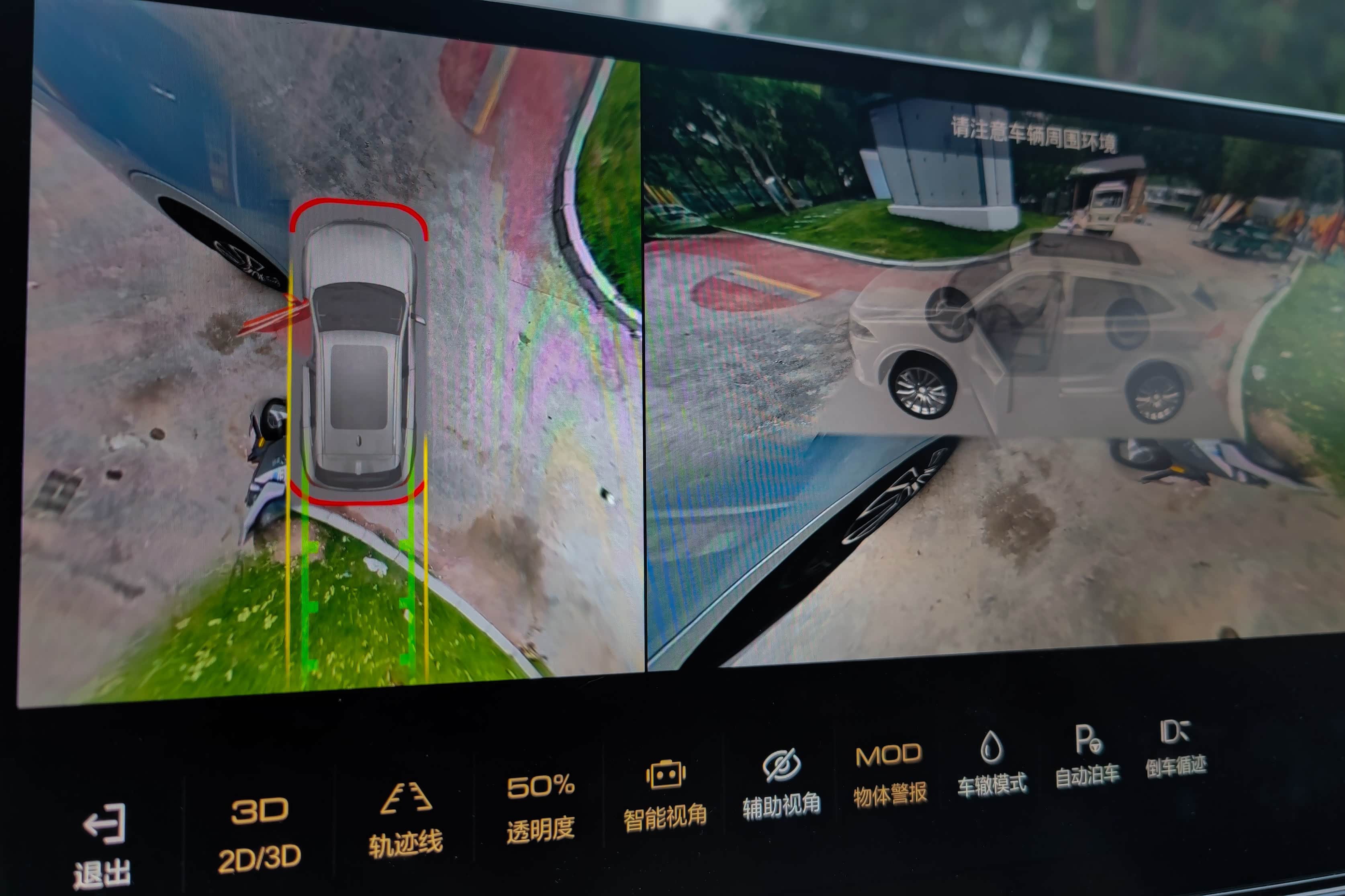 360全景影像显示效果清晰,配有透明底盘功能,看上去挺炫酷。只是在四角的衔接依然有比较明显且严重的畸变,这点还有上升空间