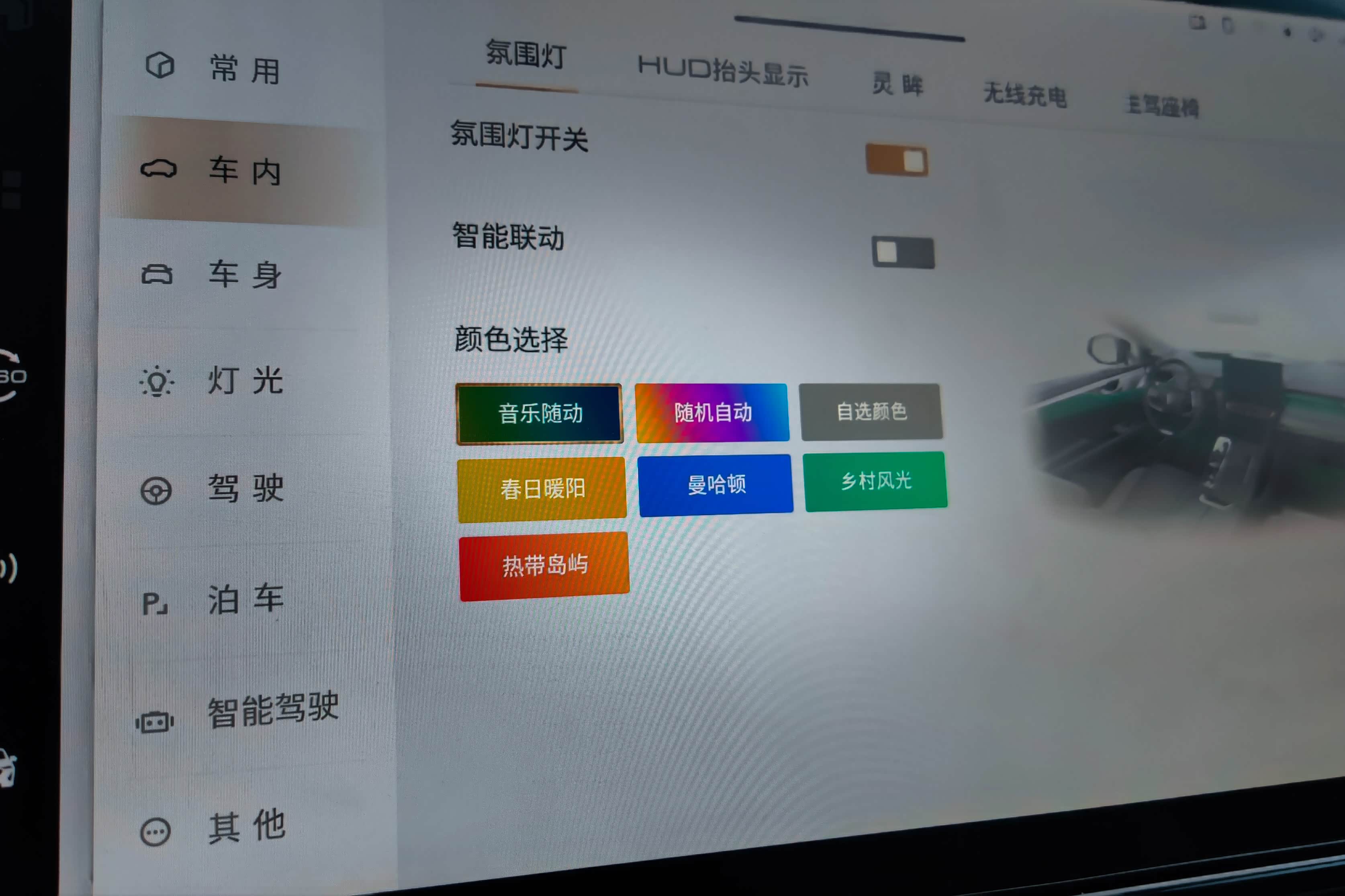 在配置信息里只提到了“多色氛围灯”并未给到具体数字有多少色,在随机变换时,感觉和奥迪的64色很相似