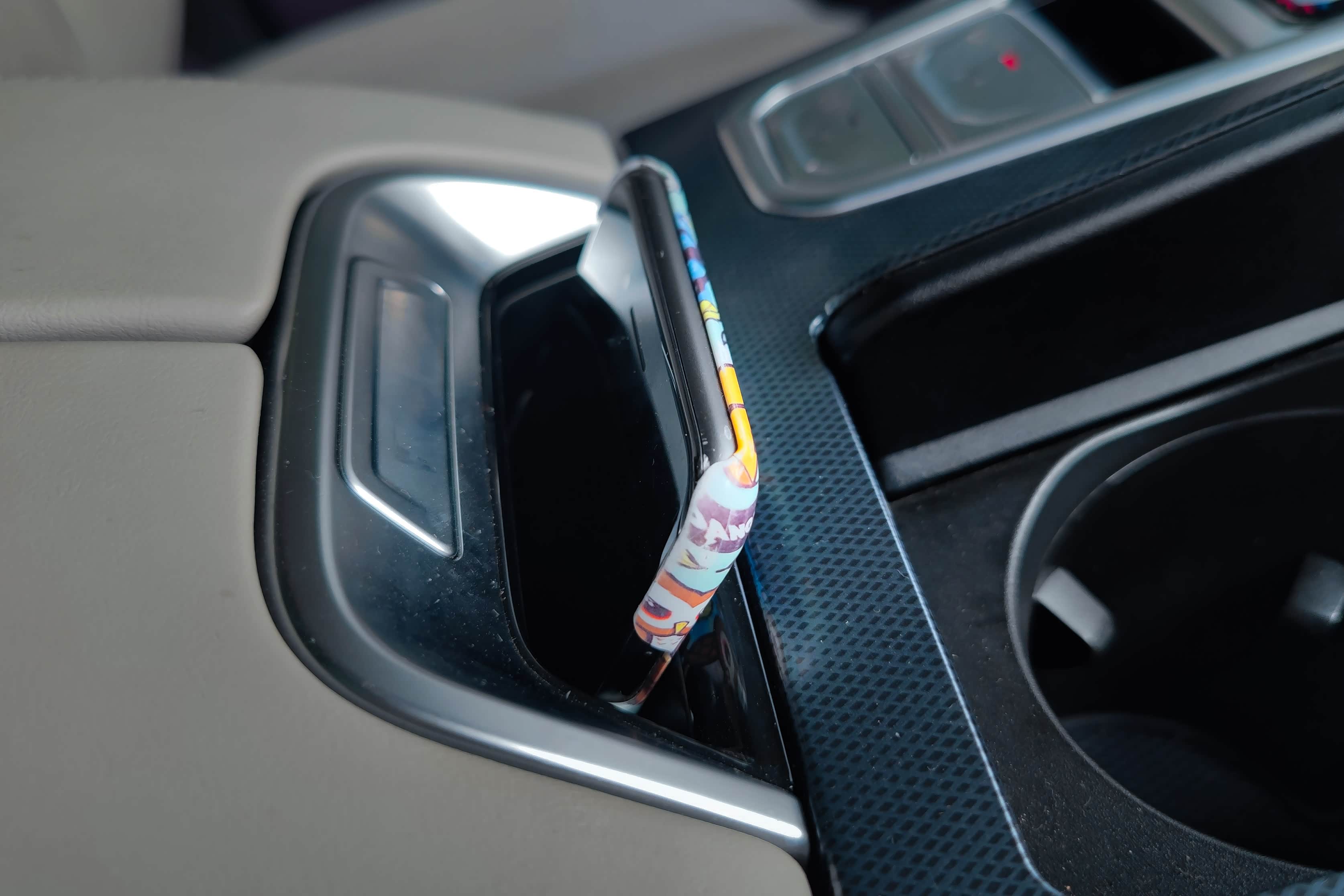 手机卡槽是一定要点赞的设计,很顺手,并且在放进去的下半段有一个轻微的挤压感,可以牢牢的将手机固定住,不会来回晃动产生异响,且带有无线充电功能。但如果你装了奇葩的异形手机壳就不好说了
