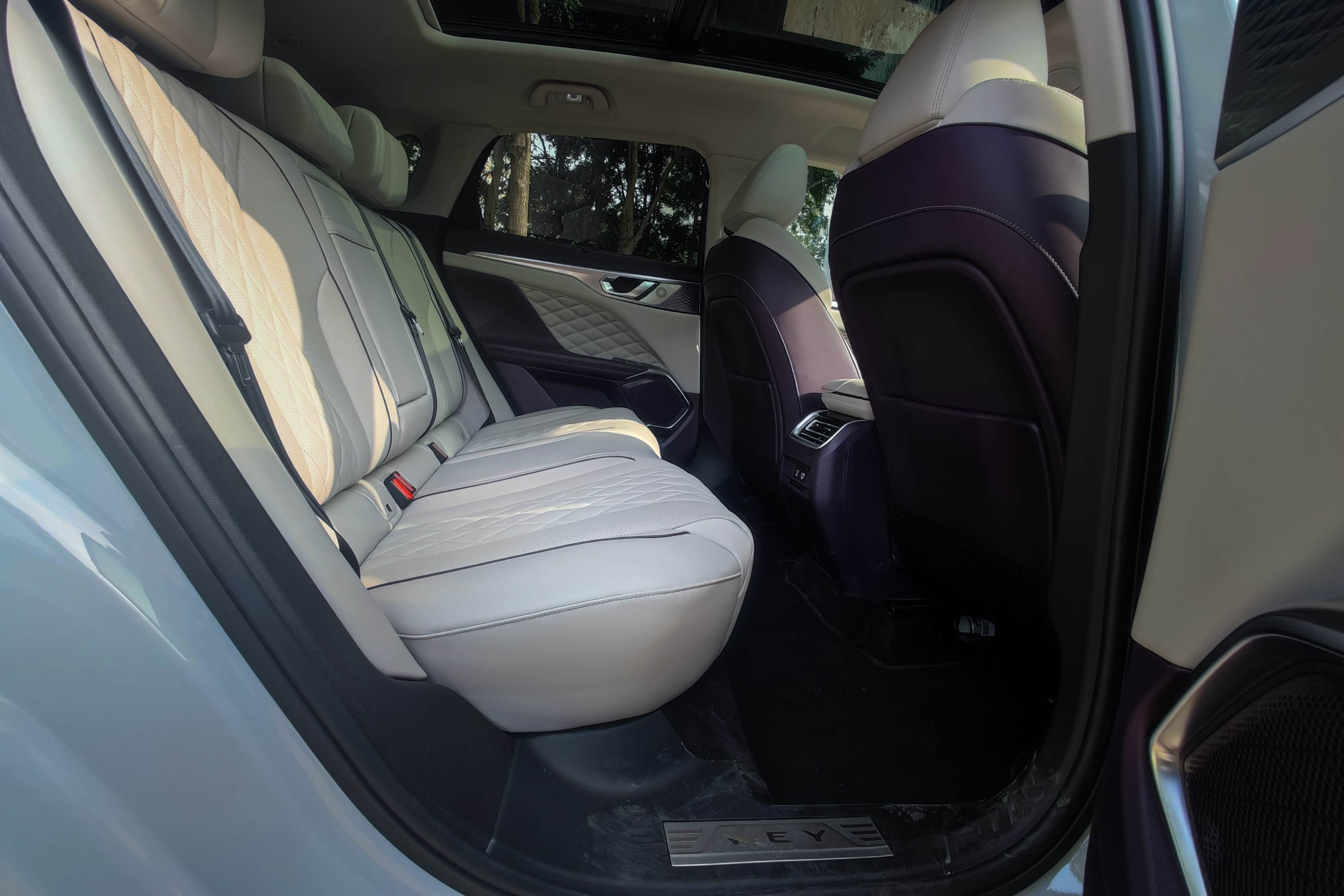 后排座椅同样舒适、宽大,厚度和长度都OK。但前座椅背板是硬质材质,懒人瘫的姿势会硌腿