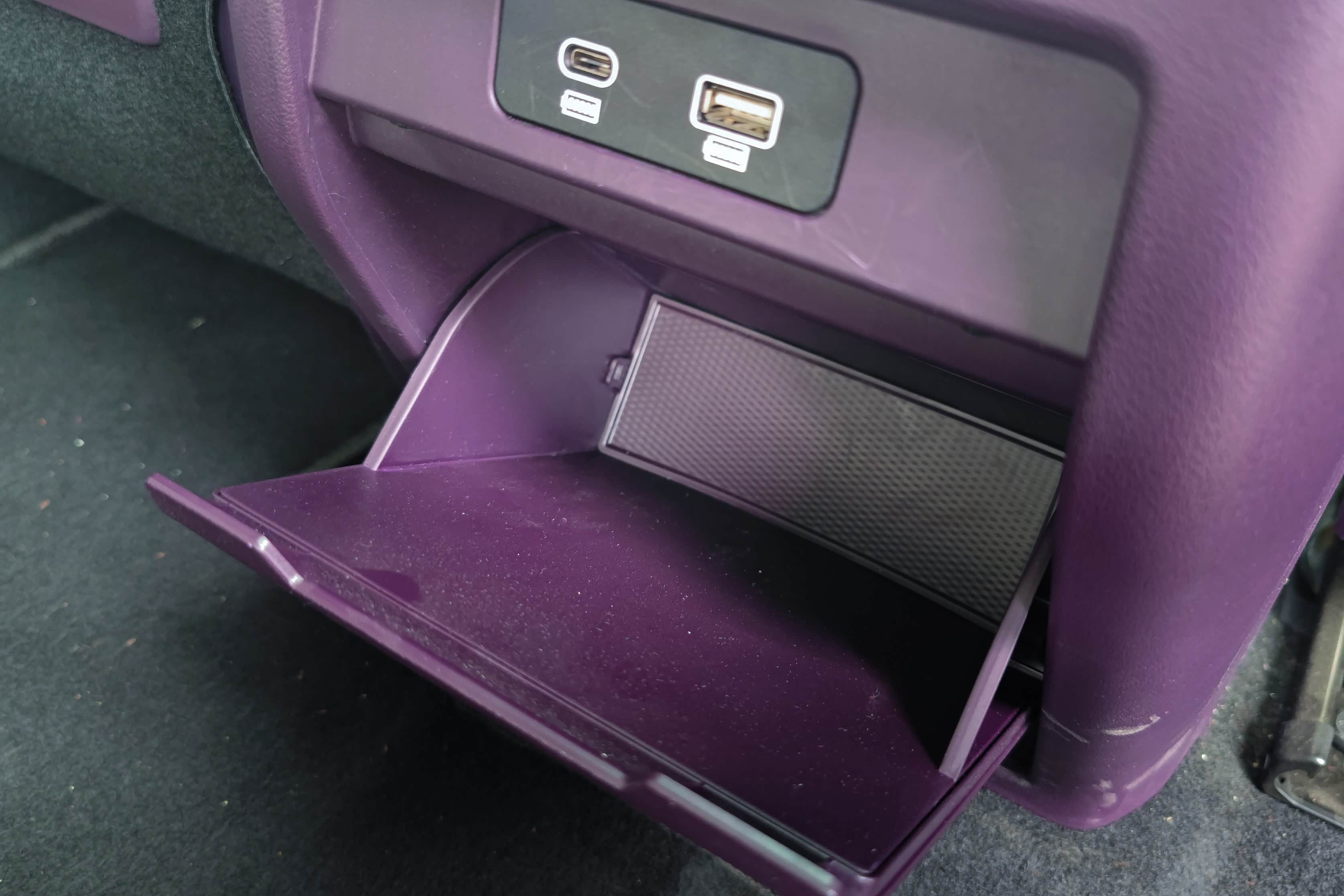 后排的充电口是常规位置,给了一个USB和一个TYPE-C快充口,下面的储物格底部有个小防滑垫,但储物格本身的材质,塑料感还是很强的,也比较单薄