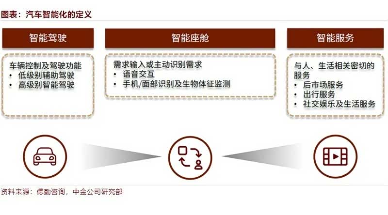 中金认为,汽车智能化的定义包括人类通过智能座舱与车端进行交互,实现无人化的驾驶体验。而人类双手被解放同时,智能座舱将致力于打造舒适的第三空间,实现智能互联新服务。随着汽车逐步走向智能化,人工智能将助力汽车打造更加个性化的驾驶体验,提供更加丰富的互动内容。目前,智能座舱及智能服务商业化落地相对顺利,而智能驾驶(高级别L3及以上的智能驾驶)则发展到了商业化的临界点,未来五到十年行业发展的挑战与机遇并存。
