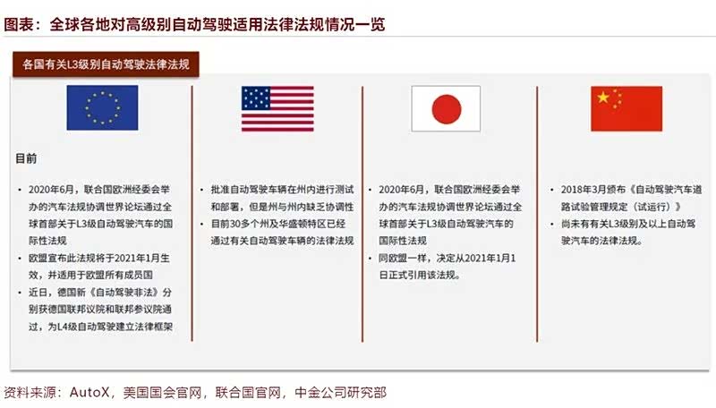 中金认为,智能驾驶是汽车智能化应用中全面商业落地实现难度最高的一环,并不断经历着挫折。但在政策和产业双擎驱动下,智能驾驶正在走出黎明前的黑暗。为了规范市场,推动智能驾驶道路测试,全球各地政策不断得到完善。中国已针对自动驾驶制定了一定的纲领性文件,有关道路交通安全的法规修订工作尚待展开。