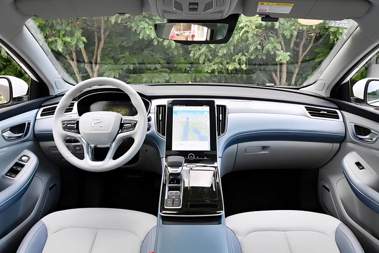 环抱式座舱进一步优化实际乘坐体验。浅蓝色的内饰看起来小巧清新,内饰材质以真皮为主,看起来也更有质感。12.3英寸全液晶仪表盘的界面设计充满科技气息。14.3英寸垂直中控屏与换档区相连。这应该是前排位置的设计重点。它看起来极具科技感和技术感,遗憾的是屏幕周围有一圈比较宽的黑边。