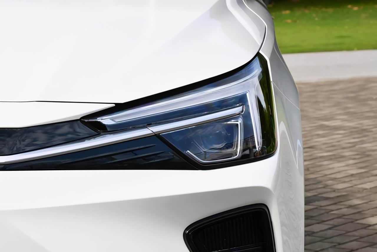 明亮的黑色面板连接两侧的前照灯组,全新的徽标嵌在中间。它几乎与荣威汽车分离。前照灯的内部镶嵌着一组像树枝一样的LED灯条。下面是传统的雾灯区域,表面简单地包裹着一块发黑的面板。鲸嘴式下进气格栅具有主动进气功能,表面设置多条发黑金属条,具有散热和优化前风阻的功能。