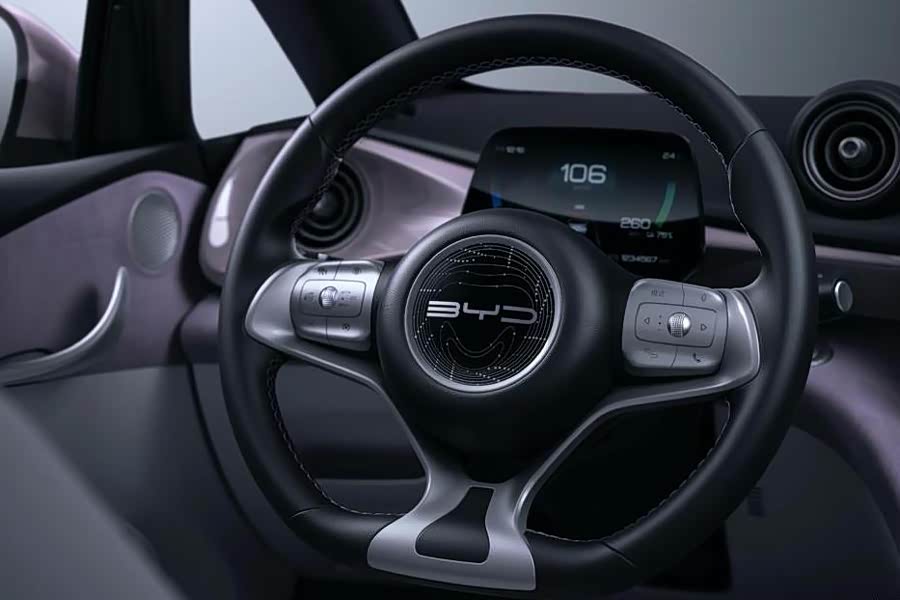 全新造型的三辐式多功能方向盘,中央BYD品牌字样,还有特殊设计的花纹图案点缀。传统三九点位置,多功能按键丰富,还有银色的饰板装饰,黑色与银色双色设计,凸显年轻。方向盘后方是一块圆角盾形的液晶仪表,尺寸不大、小巧可爱。