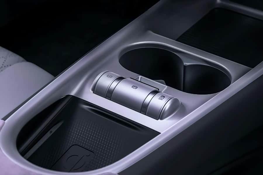 在传统的换挡杆以及扶手箱区域采用了镂空式设计,海豚自前至后则是布置了无线充电区、储物格、杯架以及控制按键等元素,控制按键能看到ESP开关、电子手刹以及AUTOHOLD按键。