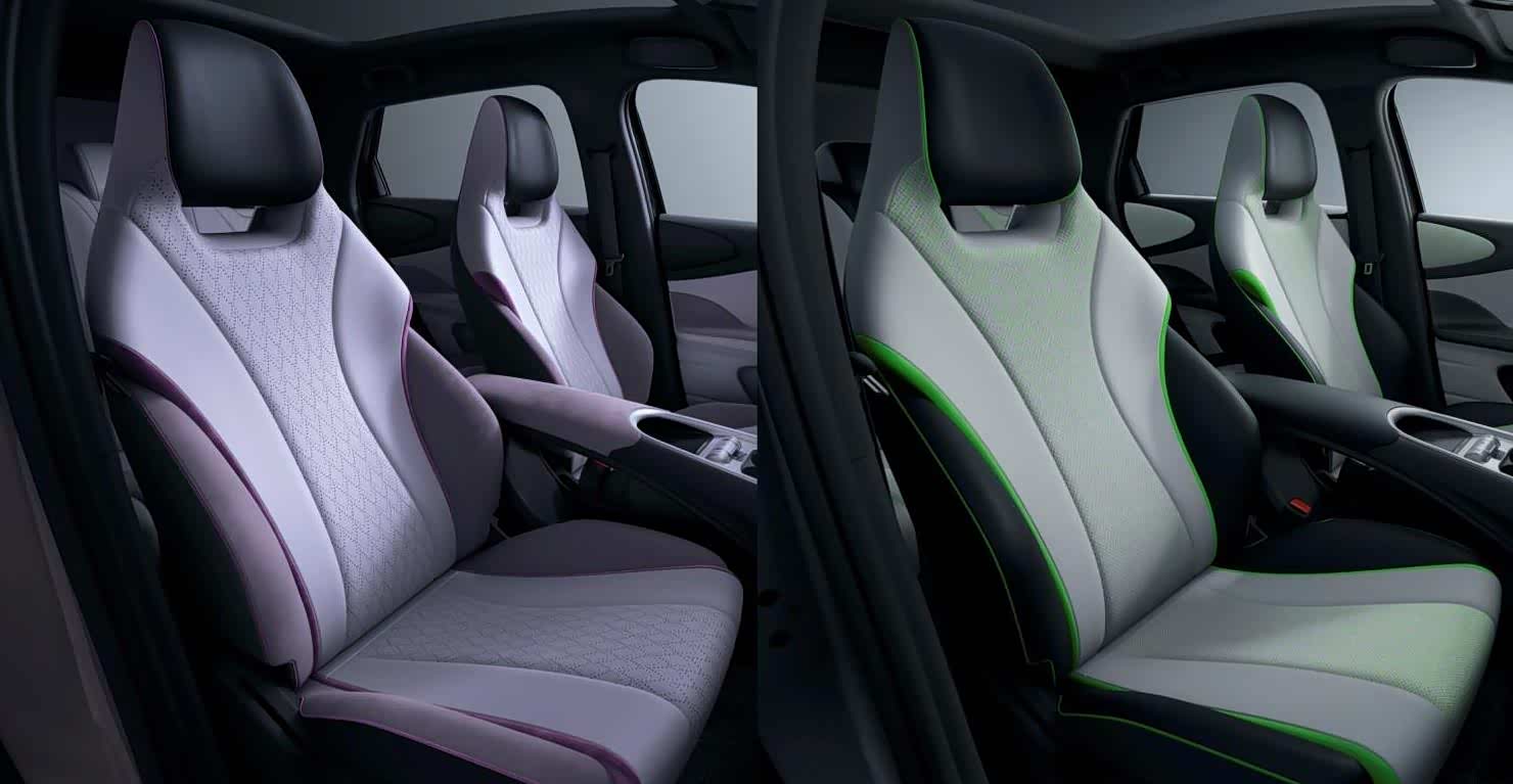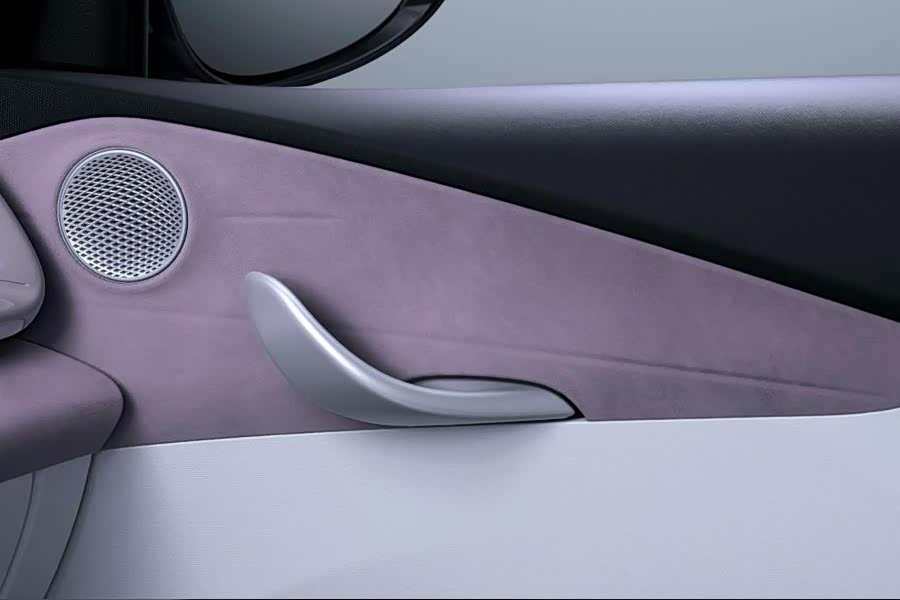 座椅部分,新车将提供名为噗噗粉和飒飒绿两种不同风格的一体式座椅,座椅材质质地采用皮革面料,但通过工艺呈现出类似织物面料的质感。另外在车门内侧部分区域也采用了Alcantara的面料包覆,进一步提升车内的档次感。有意思的是车内内侧开关把手采用了类似海豚胸鳍的造型设计,看上去比较可爱。
