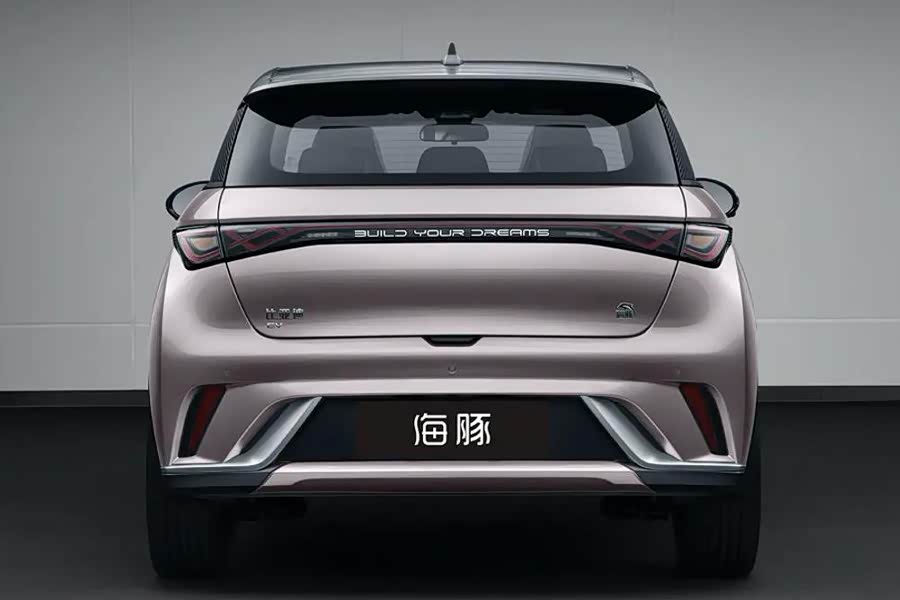 尾部,首先引入眼帘的是贯穿式尾灯,尾灯上还有经典的BUILD YOUR DREAMS”字样。尾门上左侧是比亚迪 EV字样,右边是一个海豚的动物图标。下保险杠位置左右两侧的设计和前脸部分保持了呼应,前后更加协调。
