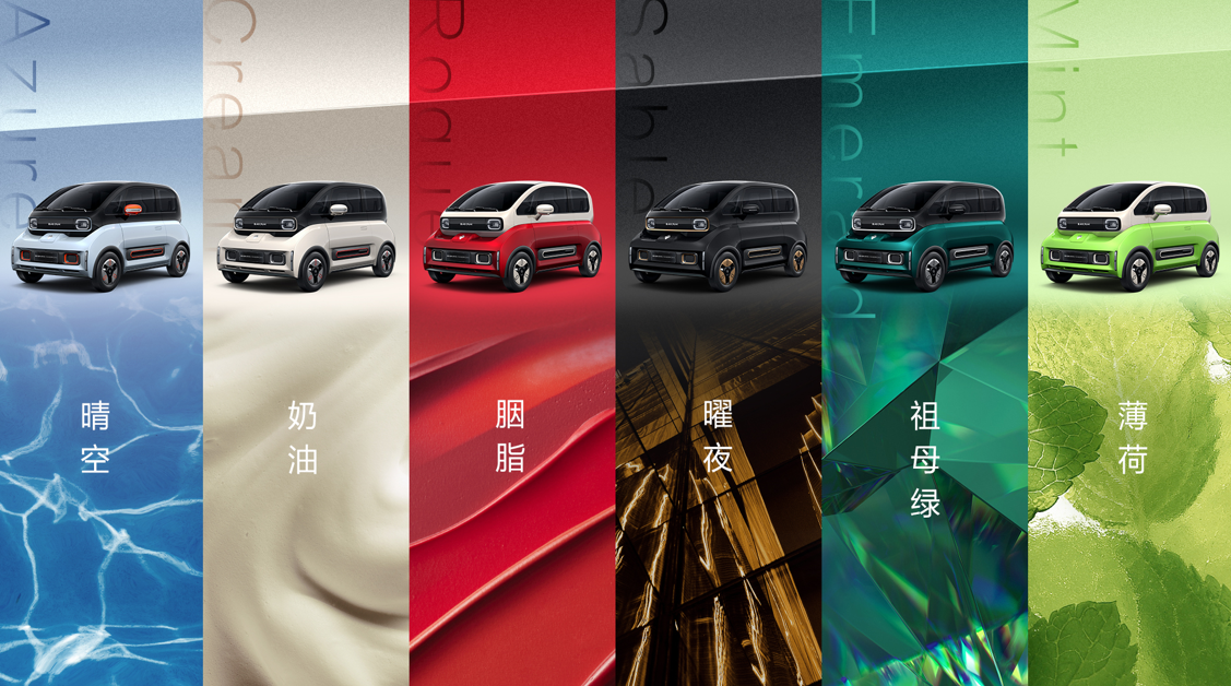 这六种配色中,曜夜并没有明显的双色车身,整车都做熏黑处理,但是在细节上增添了金色的饰条作为修饰,让整车有摩登午夜的视觉效果。奶油、祖母绿、晴空三种配色选用了黑色作为上部分车身的涂装,这让这三种配色的宝骏KiWi EV更有高级感,也更为深邃。同时,宝骏KiWi EV的晴空配色选用了太空蓝打底,并加入了加州橙点缀,风格很孟菲斯,也有种海湾石油配色的观感。至于胭脂和薄荷这两种配色,它们的车顶用了白色,搭配上更浅的车身涂装,更能凸显出夏日的清新。当然,无论是哪一种配色的宝骏KiWi EV,都能很轻松地吸引到人们的关注。