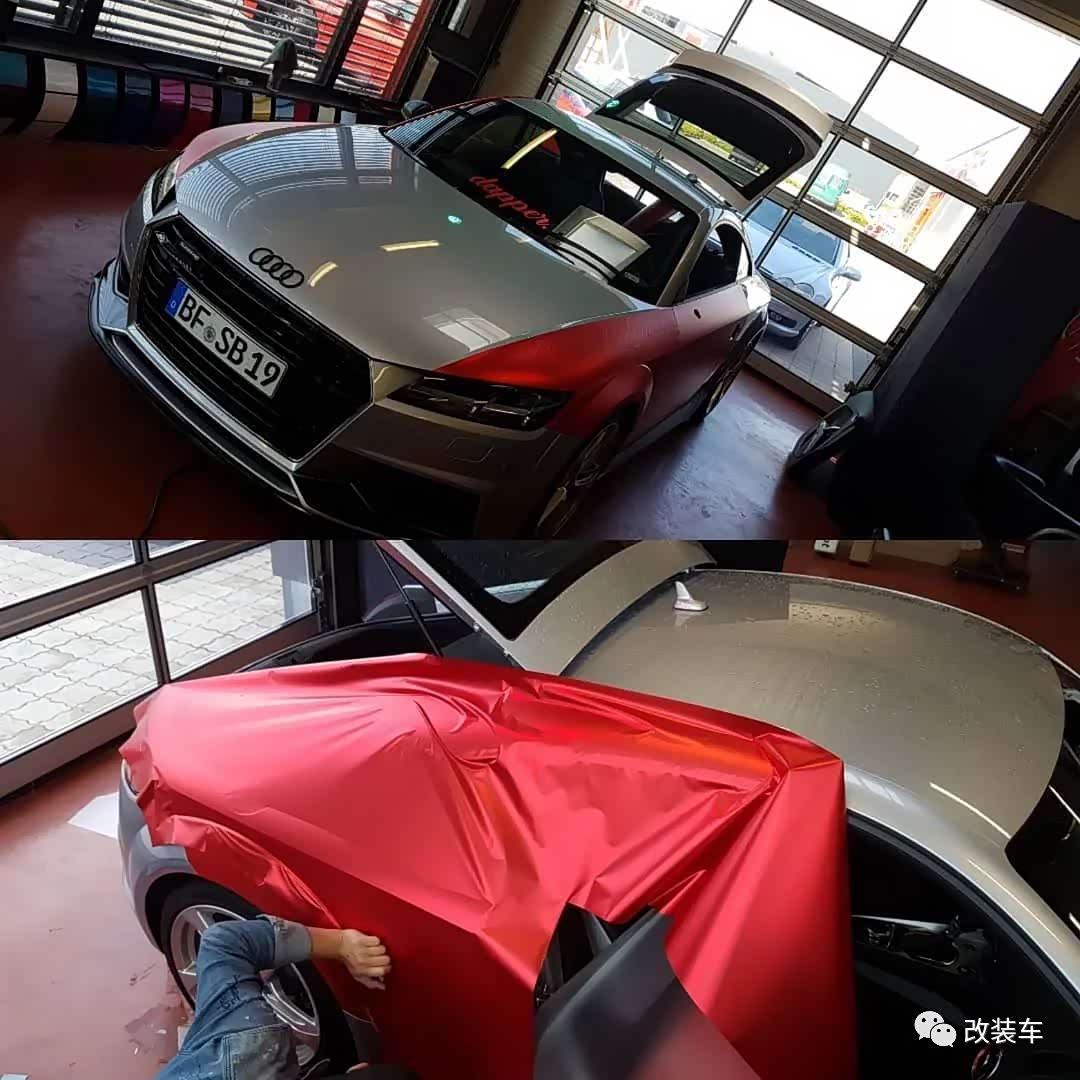 都说人靠衣装,其实车也一样,银色TT很有质感,只不过车主更喜欢闷骚一点的,所以改装第一步是先贴个哑光红改色膜。