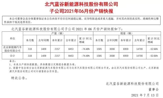 又到了车企们公布6月份以及半年以来销量财报的时候,不过俗话说好事不出门,坏事传千里,人们已经看惯了“喜报”,相反对于一些负面信息往往会更加敏感。7月13日,北汽蓝谷新能源的6月产销快报迟迟到来,销量下滑那叫一个惨烈,很快就引起了人们的关注和热烈讨论。