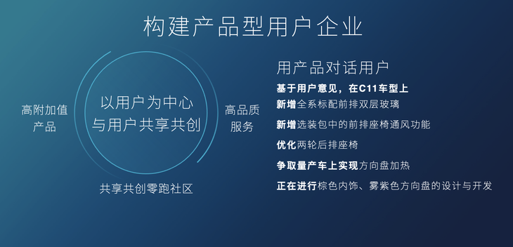 用户层面,零跑汽车光方表示要要构建产品型用户企业,以用户为中心,与用户共享共创。C11正是例子之一,零跑汽车结合用户意见,在C11上标配了前排双层玻璃、提供座椅通风选装、量产车型加入方向盘加热等。